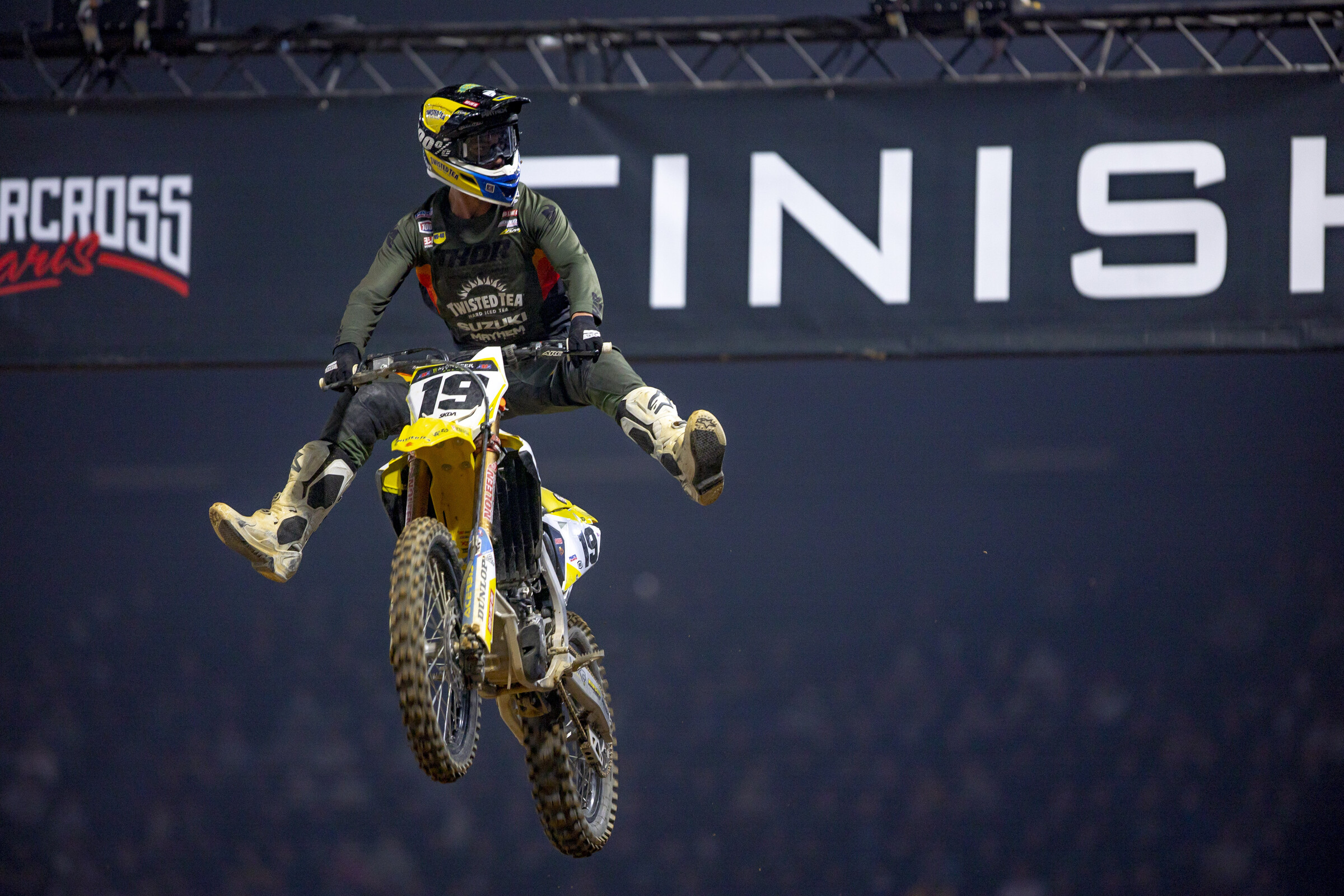 ![Bogle debuted on the Twisted Tea/HEP Motorsports Suzuki RM-Z450 at the Paris Supercross in November.]()