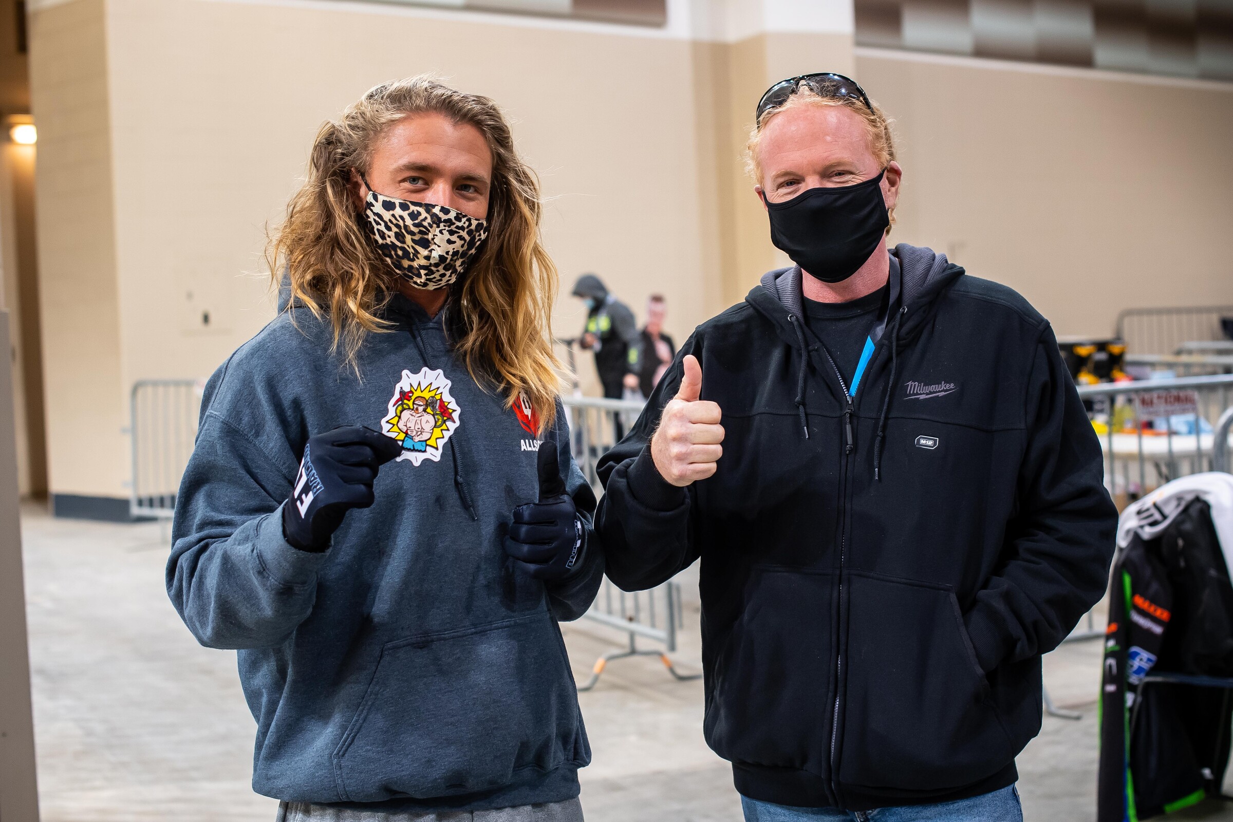 Every photog’s worst nightmare came true for Rich Shepherd at round two this year when Curren Thurman’s bike launched off track directly into Rich’s face while he was shooting. Before I even found out this happened, he was in the ambulance to the ICU and spent a couple nights there recovering before they kicked him out with worry he would catch COVID-19 in there and general overcrowding concerns (his ribs were broken/lungs were bruised/one collapsed.) All that said, he overcame huge pain and injury to come back a few rounds later! To surprise him I had my good friend Matt Rice draw up a ridiculous sticker of him breaking a bike in half. Getting him and Curren together for a pic was a must, especially with Curren running the sticker. This one had to be in our top photos of the year! Love you, Rich!