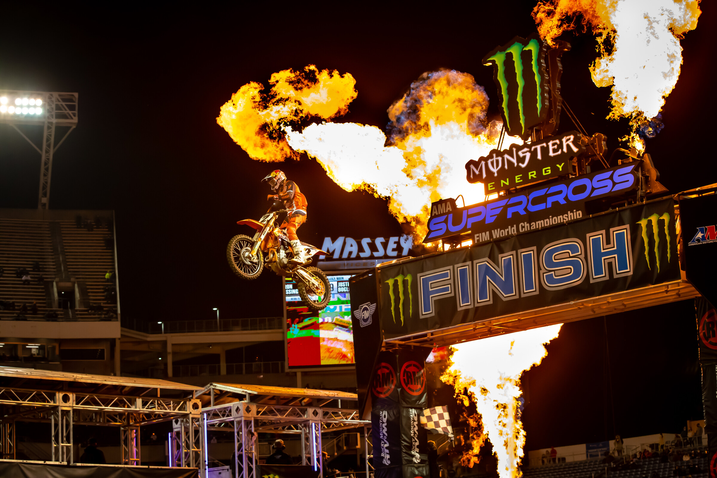 Cooper Webb was very impressive this year and proved his dominance with the 2021 Monster Energy AMA Supercross title. This win in Orlando was a photo I really liked because to take a shot like this, it is hard to balance the exposure of the flames to the action/ambient light in the stadium. Happy with how this one came out.
