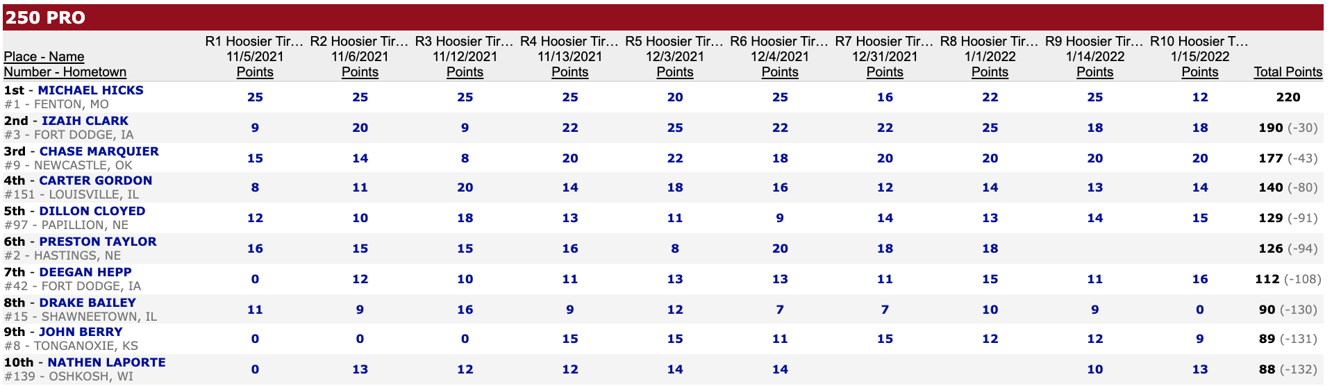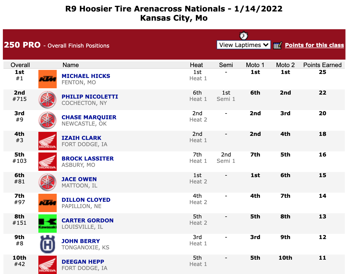 | Michael Hicks (KTM) | Hoosier Arenacross Series | 250 Pro |