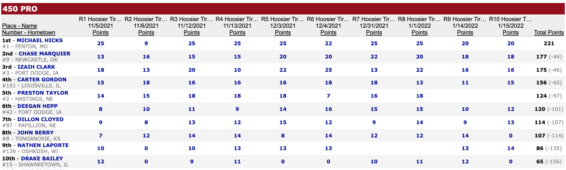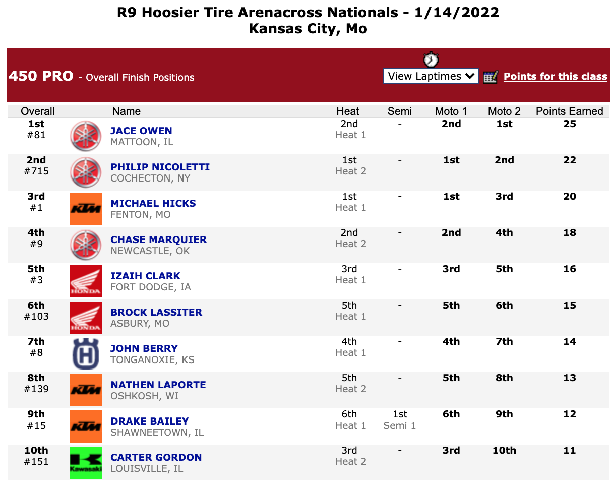 | Michael Hicks (KTM) | Hoosier Arenacross Series | 450 Pro |
