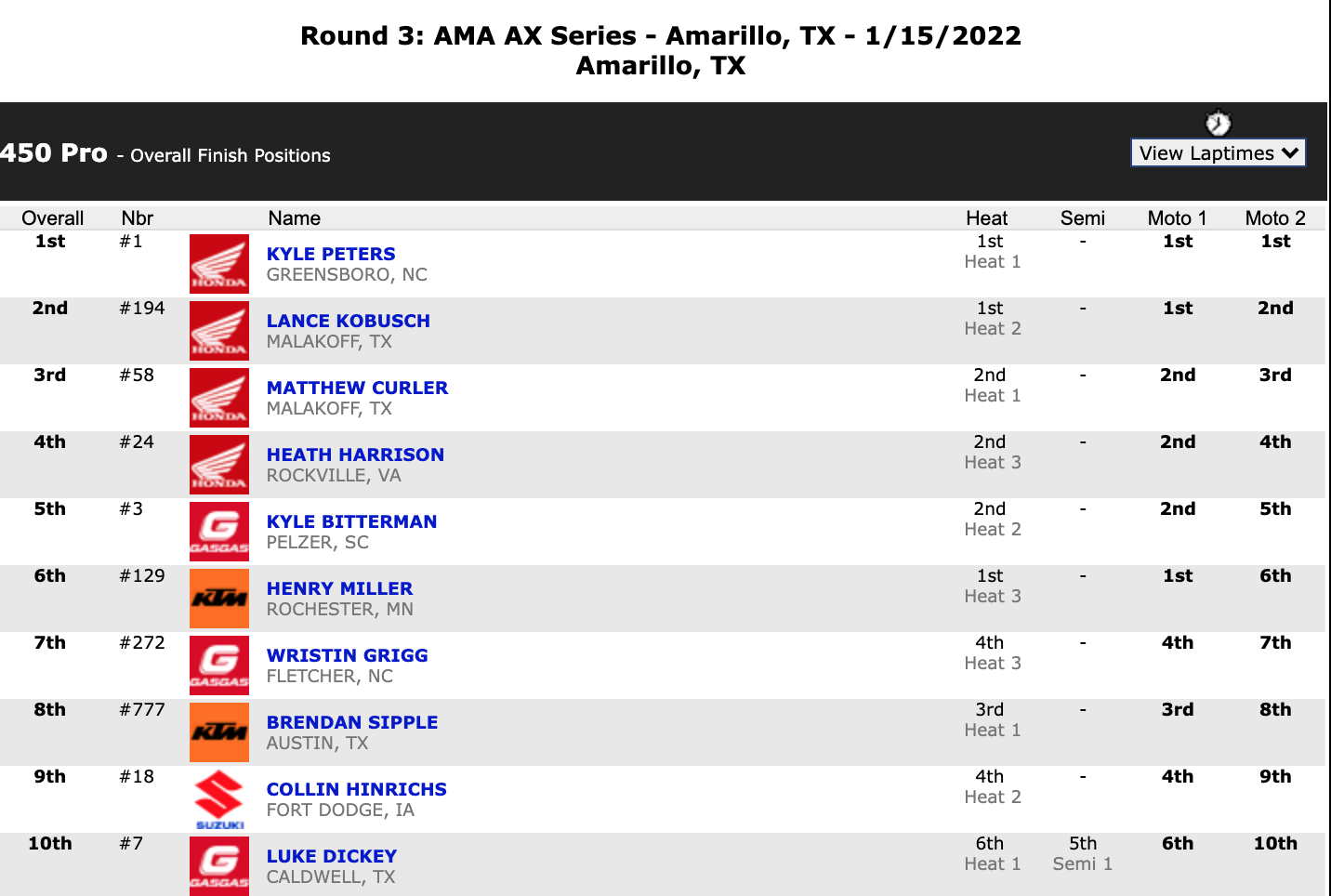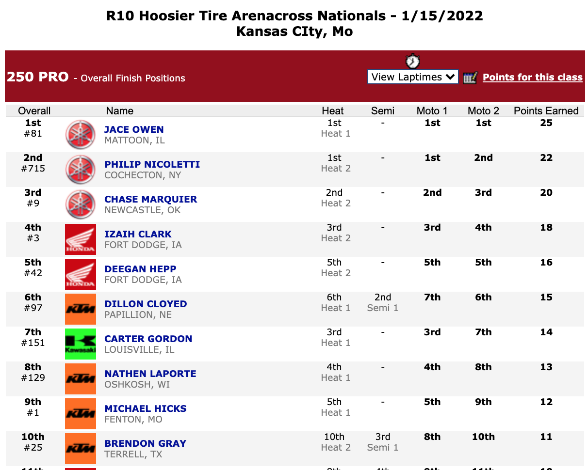 January 15, 2022| Rider | Time | Interval | Best Lap | Hometown | Bike | |