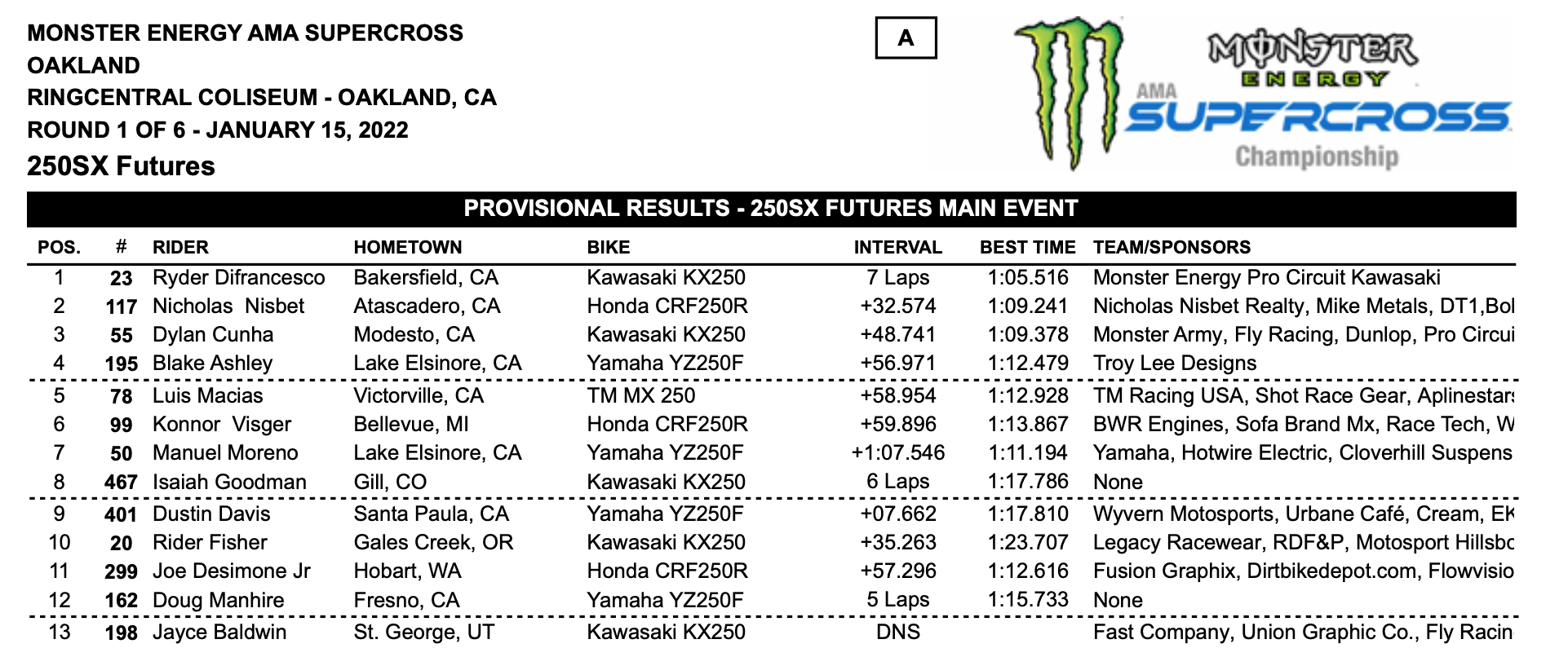 Ryder DiFrancesco Wins 250SX Futures Main Event at Oakland Supercross