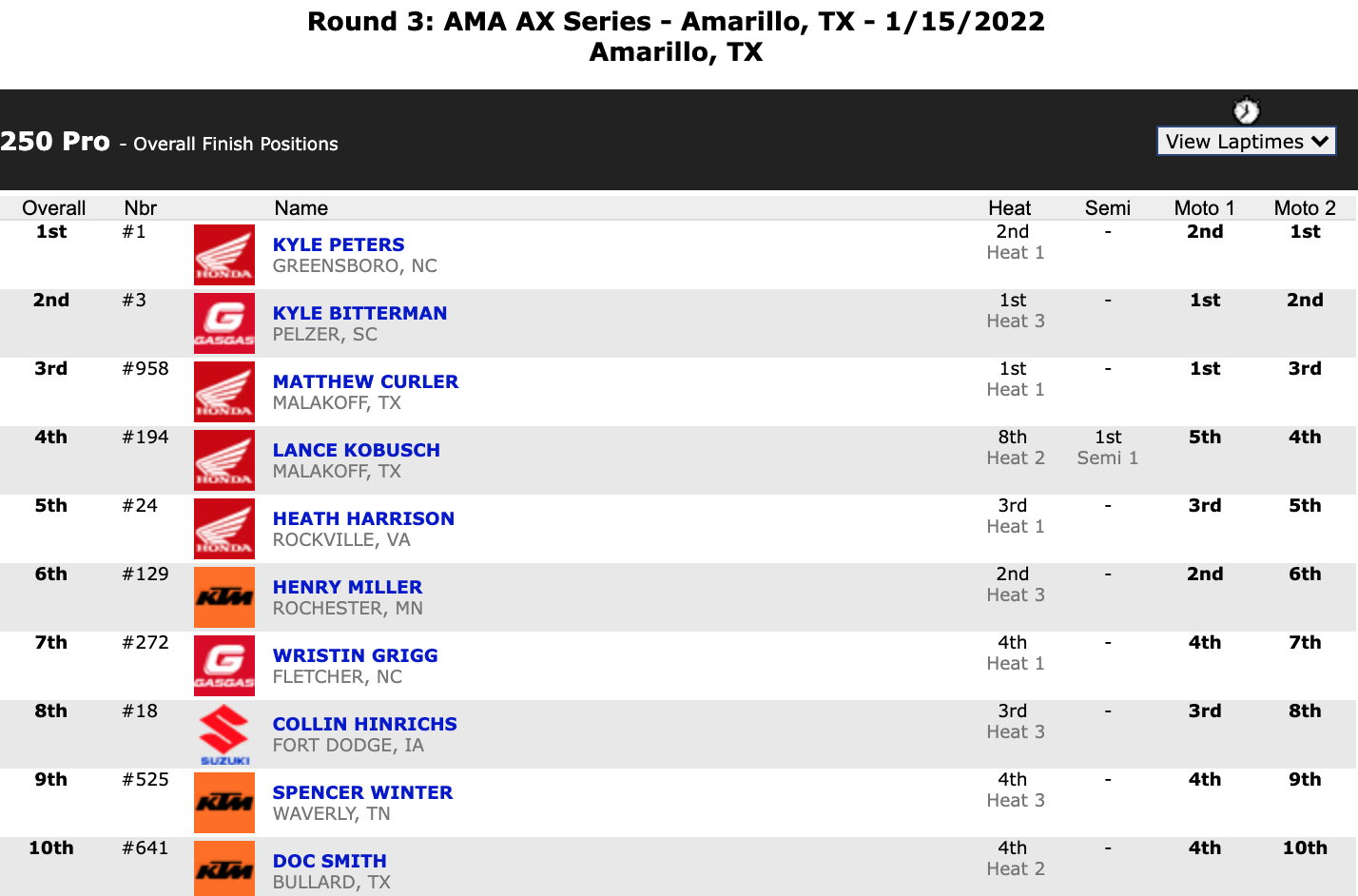 | 9 | Chris Blose | +54.645 | 1:02.913 | Phoenix, AZ | GasGas MC 250F | |