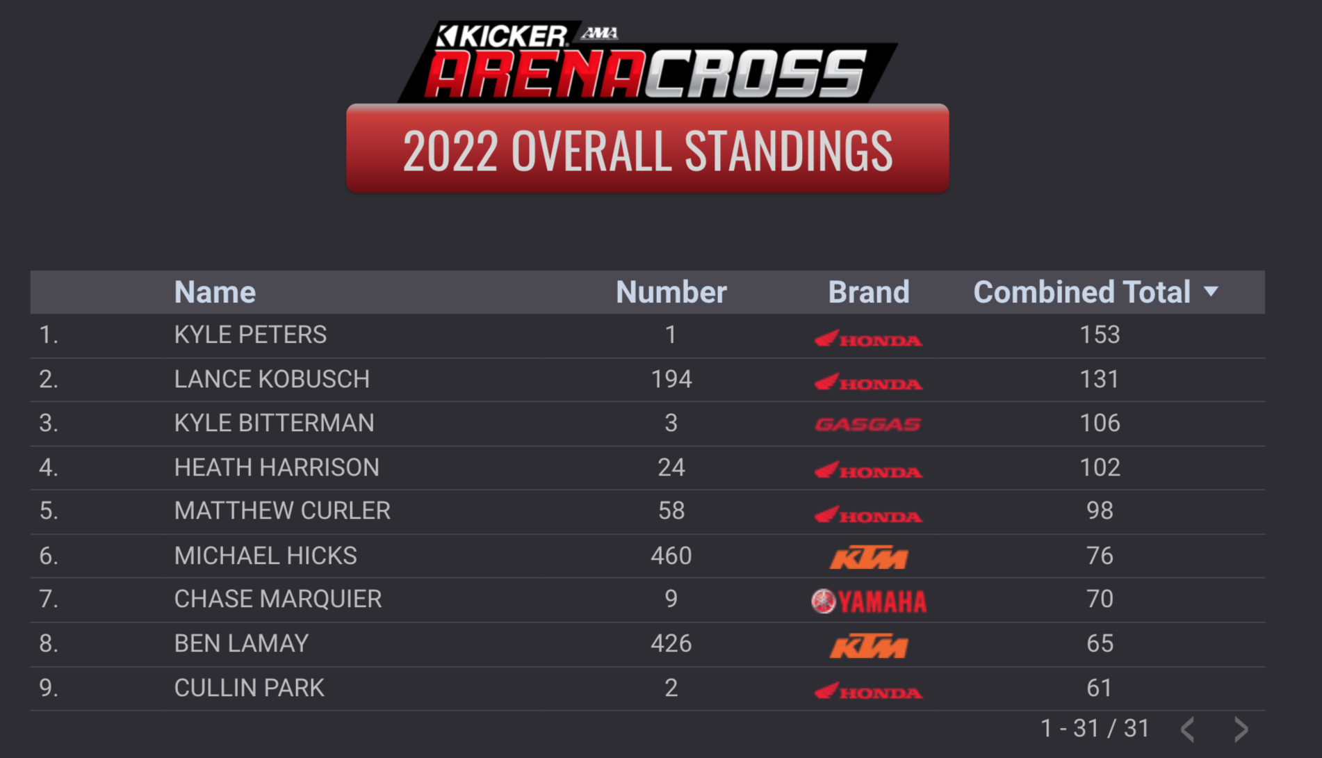| Kyle Peters (Honda) | AMA Kicker Arenacross Series | Pro National Champion |