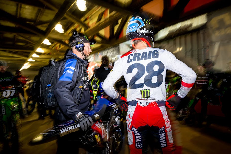 Then, early in the opening lap of the second 250SX race, Craig and Friese tangled in the sand section, as Craig was thrown off his Yamaha and onto the ground beside the track. He was visually unhappy with Friese’s move as he tossed his hands into the air. Craig remounted last and would go on a charge similar to the one he pulled off only a few weeks ago in San Diego, California, following a first-turn pileup. Craig came all the way back from dead last (one rider did not start so Craig was officially 21st) to fifth place, but then got Jalek Swoll on the last lap to finish fourth, even giving Friese a bump of his own as he passed the #62. After the race, Craig wanted to stop to talk to Friese, but his mechanic and team members encouraged him to head to the Yamaha truck instead.