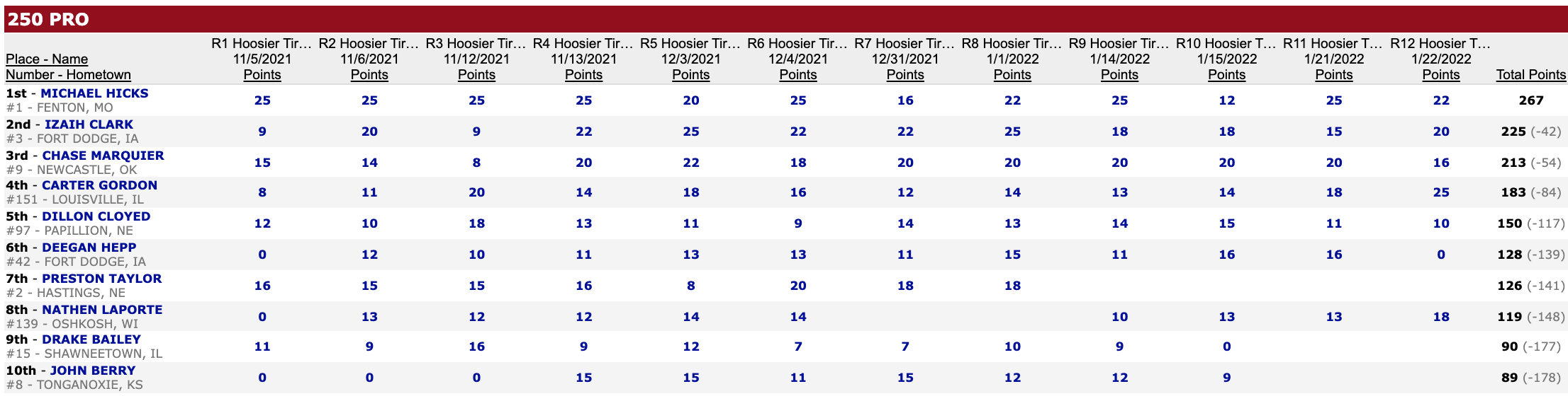 | Position | Rider | Hometown | Points |