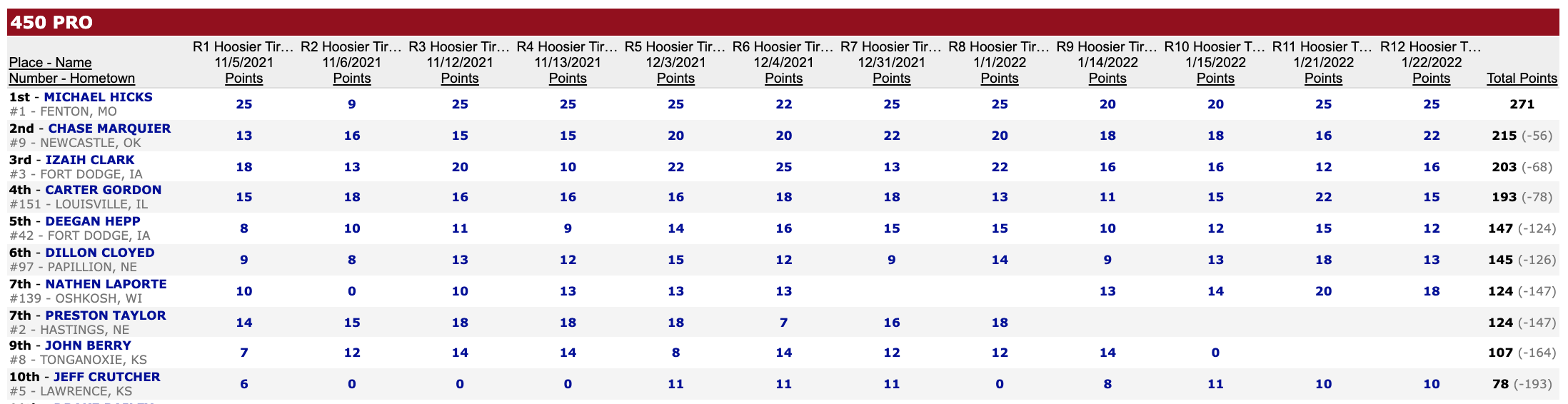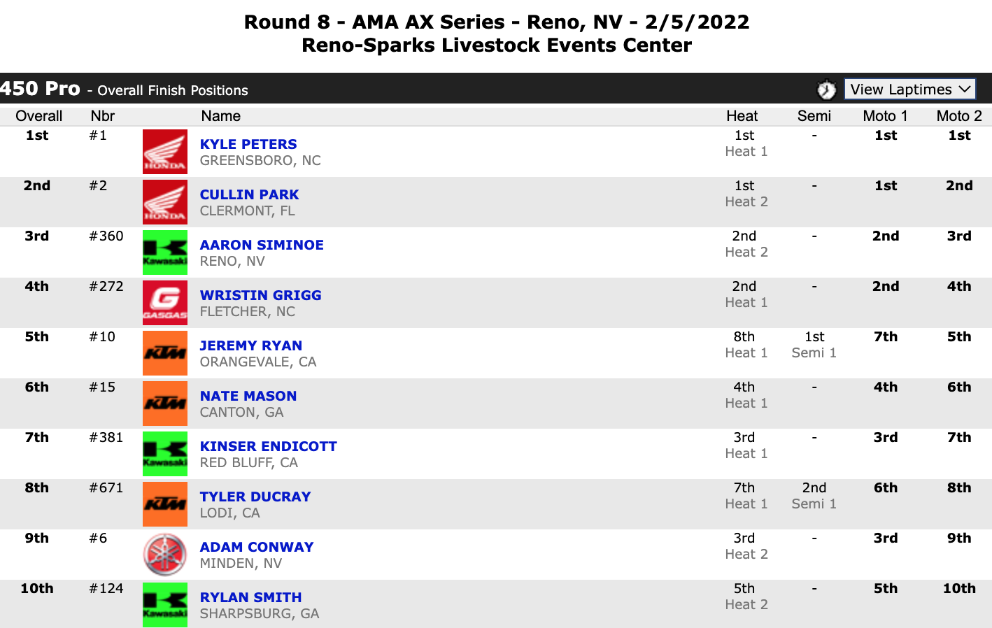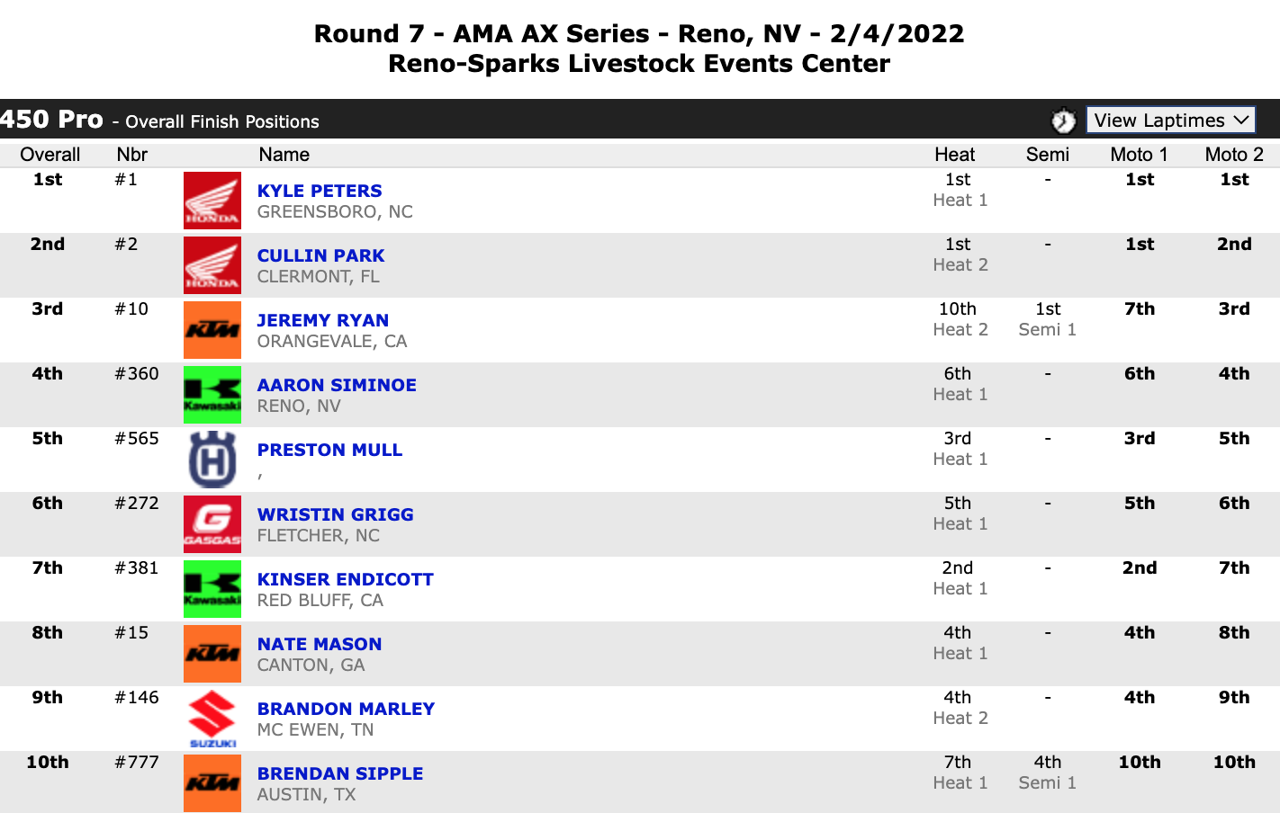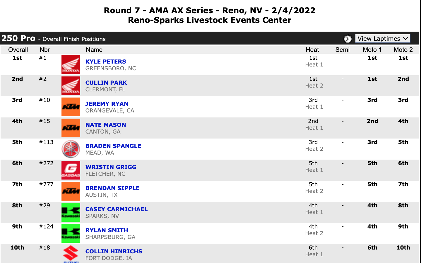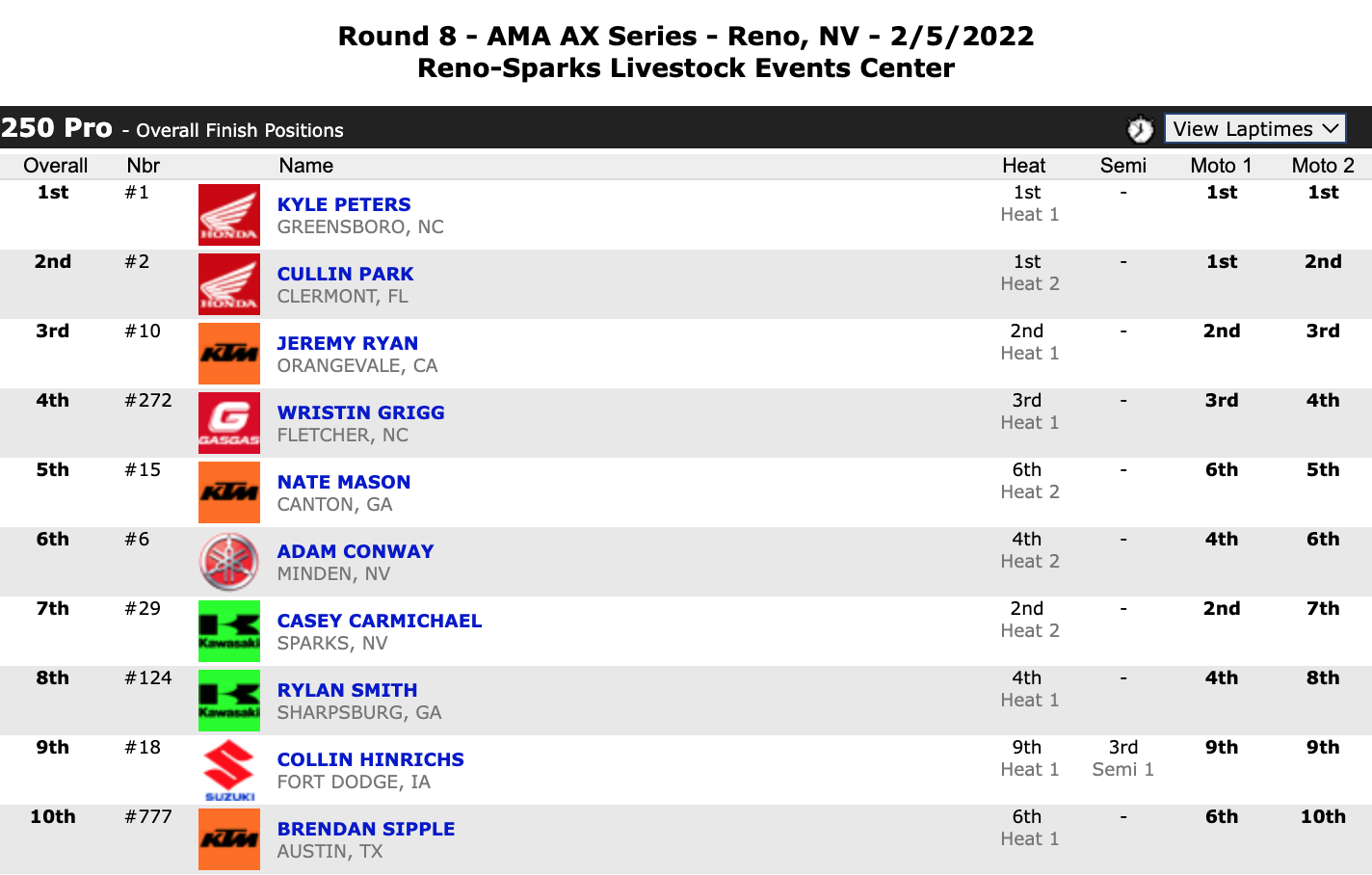 February 5, 2022| Rider | Hometown | Motos | Bike | |