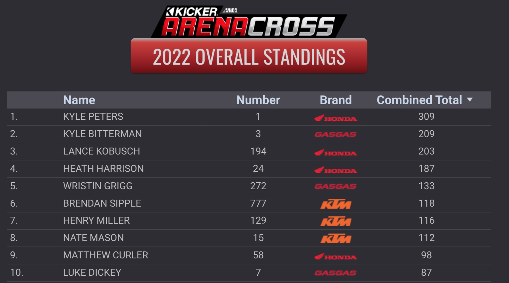 | Kyle Peters (Honda) | AMA Kicker Arenacross Series | Pro National Champion |