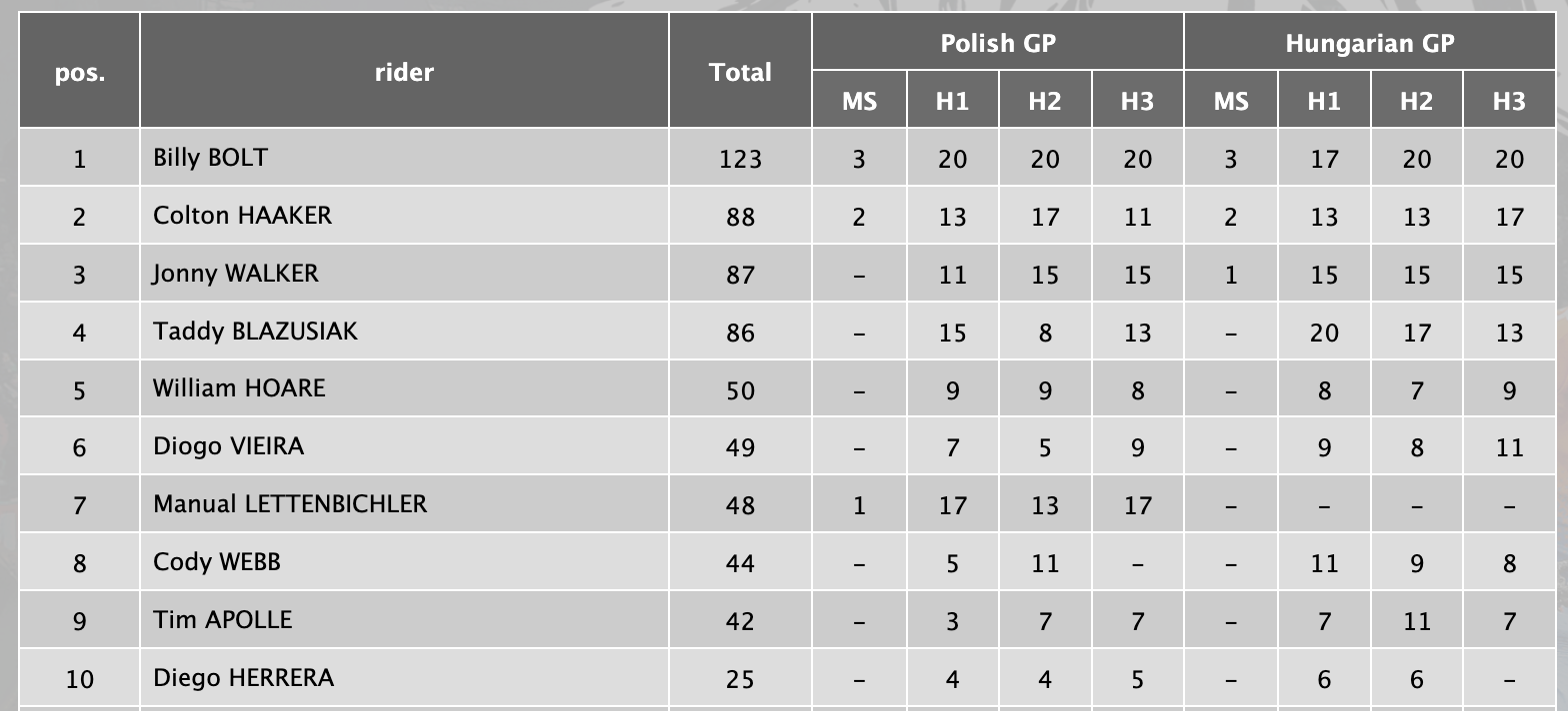 1. Billy Bolt | Husqvarna | 60 points