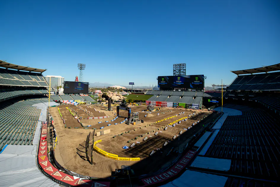 For the third time in 2022, Monster Energy AMA Supercross is taking over Angel Stadium in California. So far, we have seen some great racing in both classes and today will mark the final 250SX West Region race for a few weeks as we will head to Minneapolis, Minnesota, next weekend for the kickoff of the 250SX East Region. Today, the 250SX West Region riders will look to end the first West Coast swing on a high note. We should be in for ideal temperatures tonight and no precipitation on the forecast. Six 180-degree turns, a sand section, and a long whoops section could make for another great night of racing at Angel Stadium.