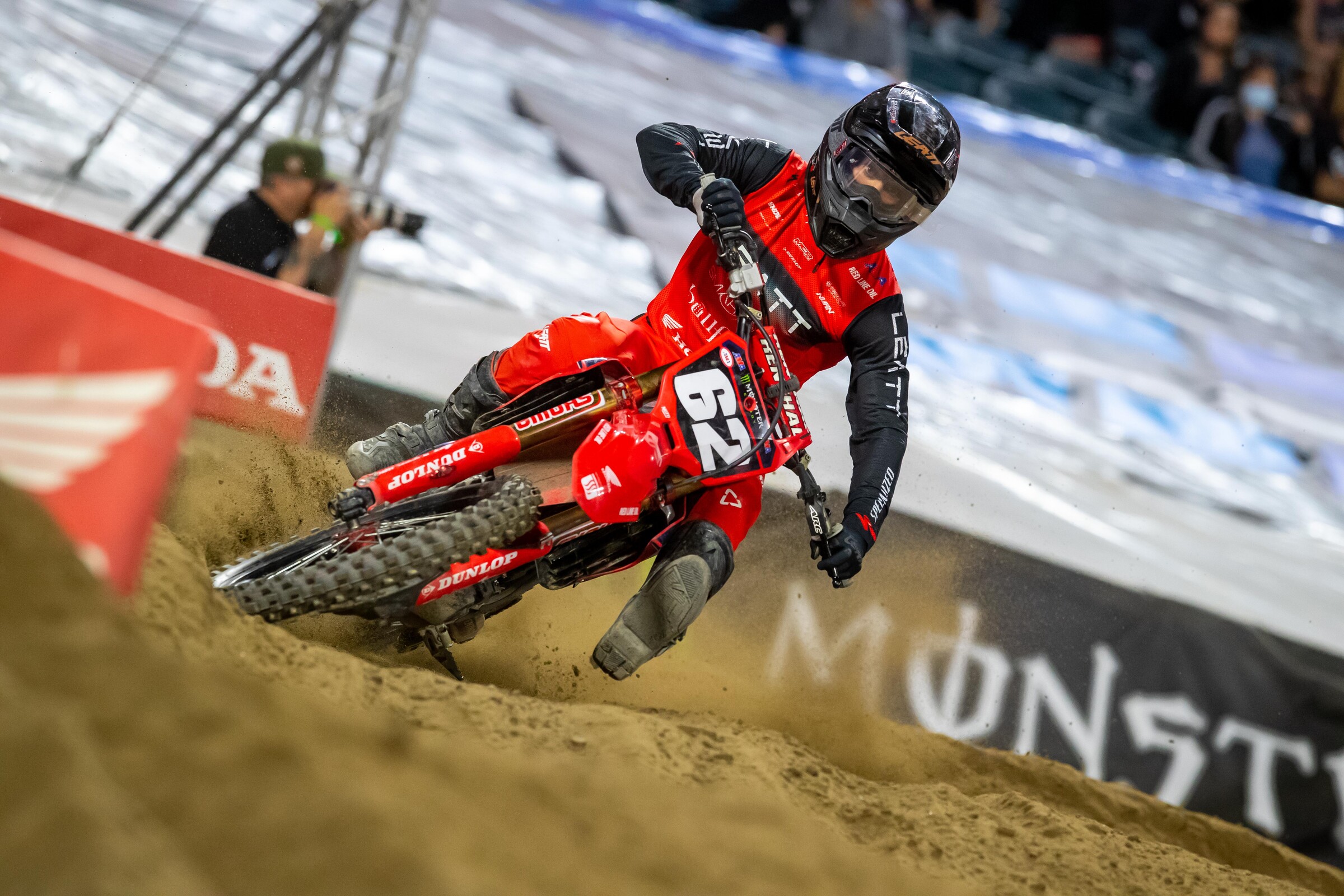Been a wild seven days for SmarTop/BullFrog Spas/MotoConcepts Honda’s Vince Friese. After a high-profile incident with Christian Craig last weekend in Glendale, he survived a tough track with brutal whoops in Anaheim to finally lock down a podium finish at round six of Monster Energy AMA Supercross. It’s been a long time coming and Friese admits the pressure to finally close was there during the final laps.