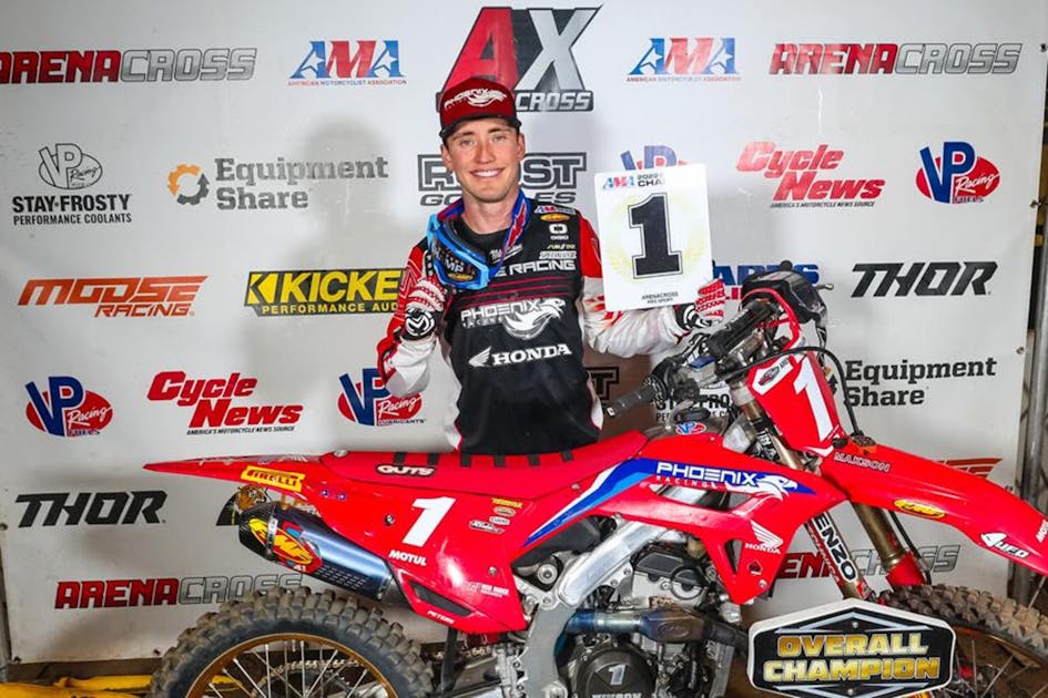 Phoenix Racing Honda’s Kyle Peters, swept the four pro mains across the weekend, bringing his total Arenacross wins to 54 all time. He also secured his official AMA Arenacross Championship title, his third in a row and fourth for the Phoenix Racing Honda team (Jace Owen won the Arenacross title in 2019 for the Phoenix Racing Honda team). Teammate Cullin Park finished fifth overall in the 2022 AMA Arenacross Series.