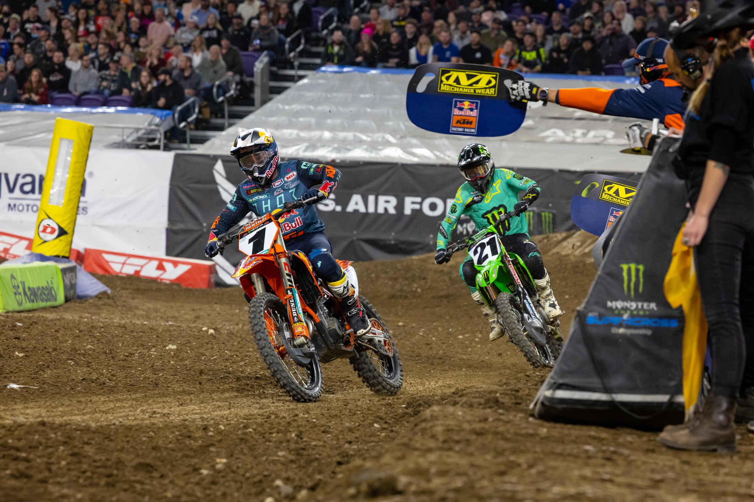Red Bull KTM’s Cooper Webb saw his title defense on life support after hovering around the eighth-place spot the last few weekends in Monster Energy AMA Supercross. The move to the eastern-style tracks would provide perhaps his last gasp at a turn around, and things indeed moved in a better direction in Minneapolis with a second-place finish, remarkably just his second podium of the year. There’s still work to be done, as Webb could have easily have finished fourth had Malcolm Stewart and Chase Sexton not crashed, but he was closer to the lead pace, overall, regardless.