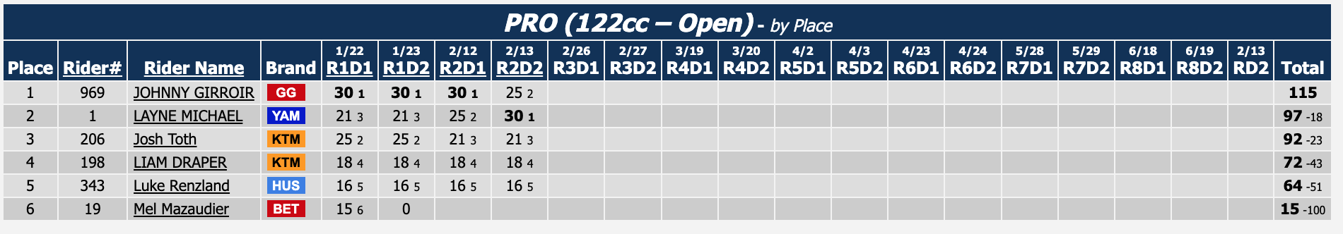 February 19, 2022| Rider | Time | Interval | Best Lap | Hometown | Bike | |