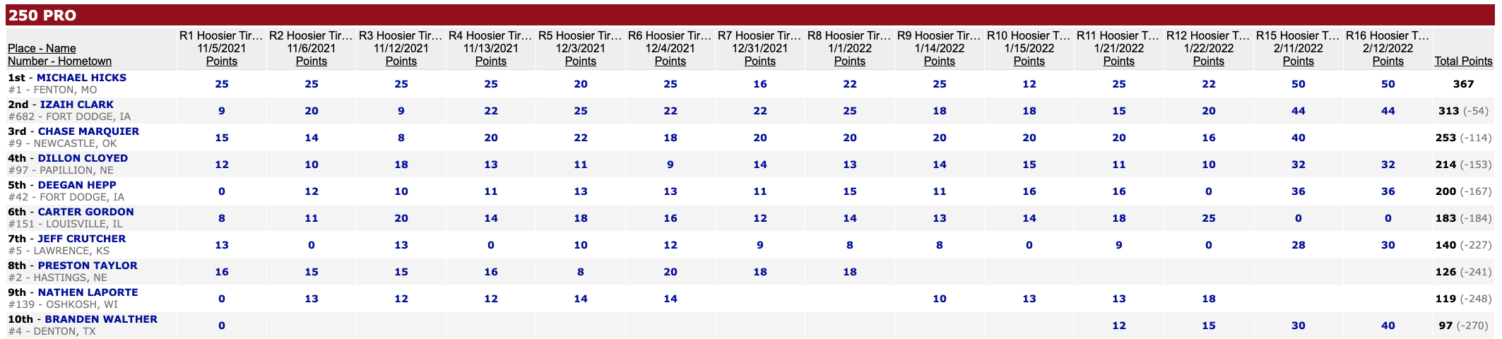 | Michael Hicks (KTM) | Hoosier Arenacross Series | 250 Pro |