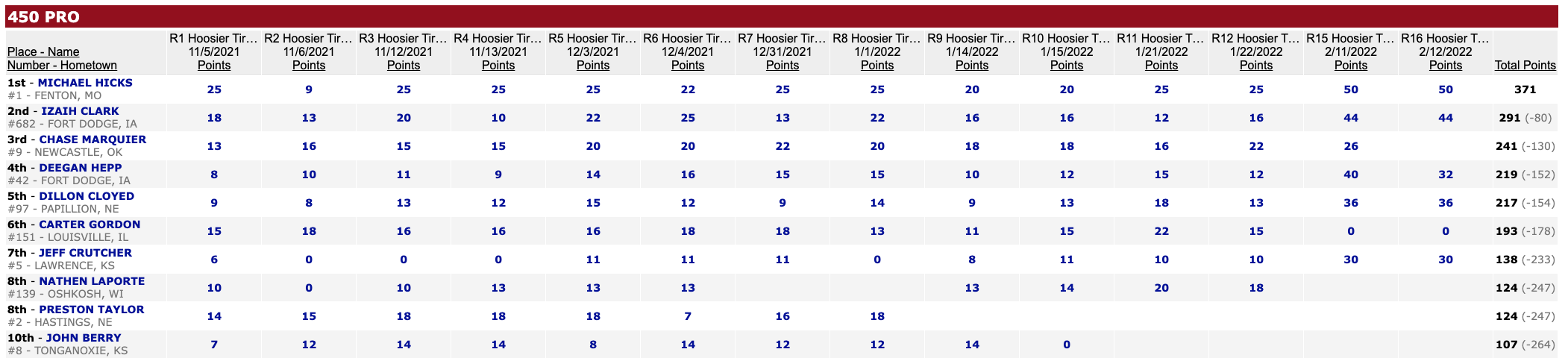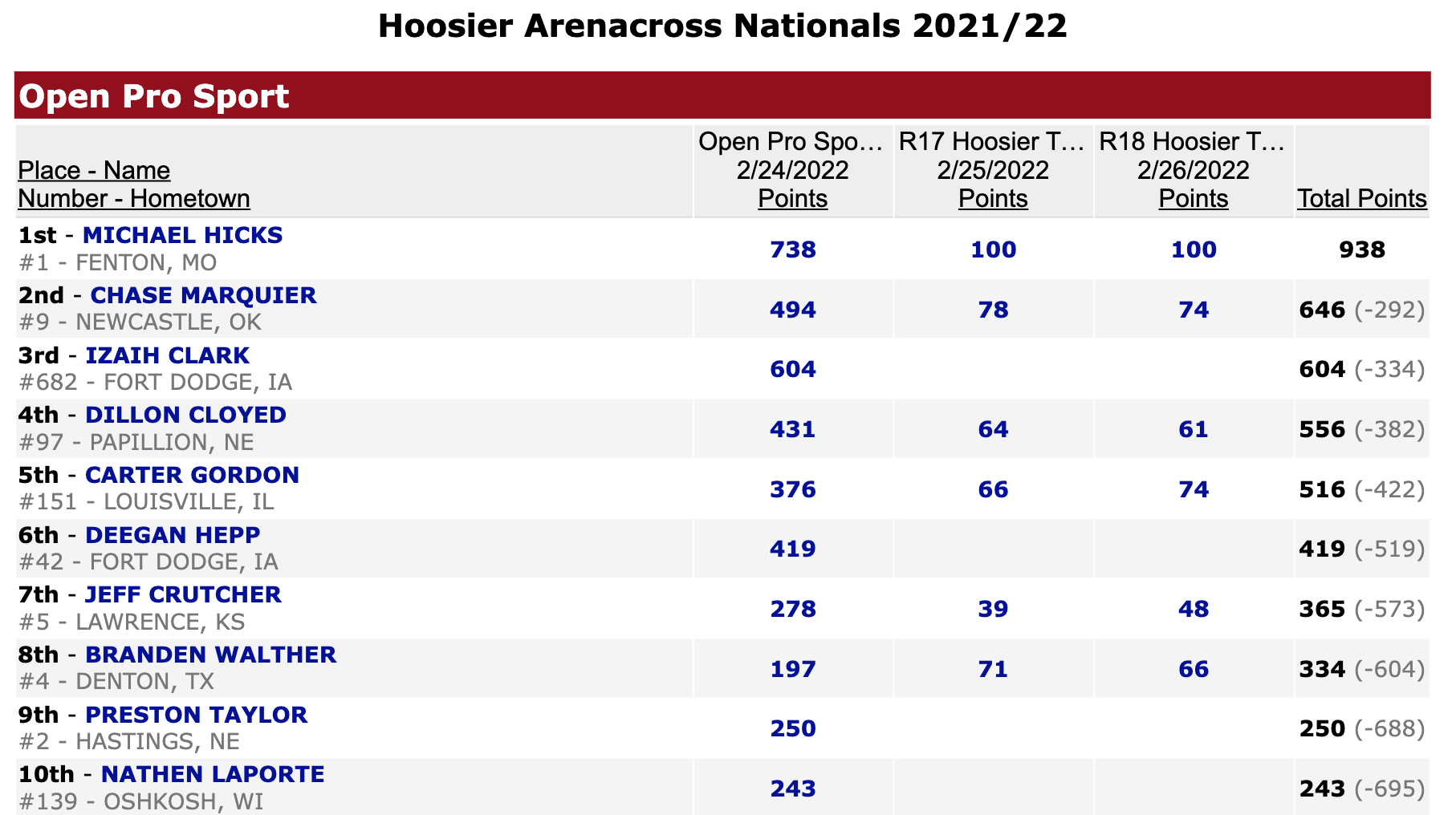 | Michael Hicks (KTM) | Hoosier Arenacross Series | 450 Pro |