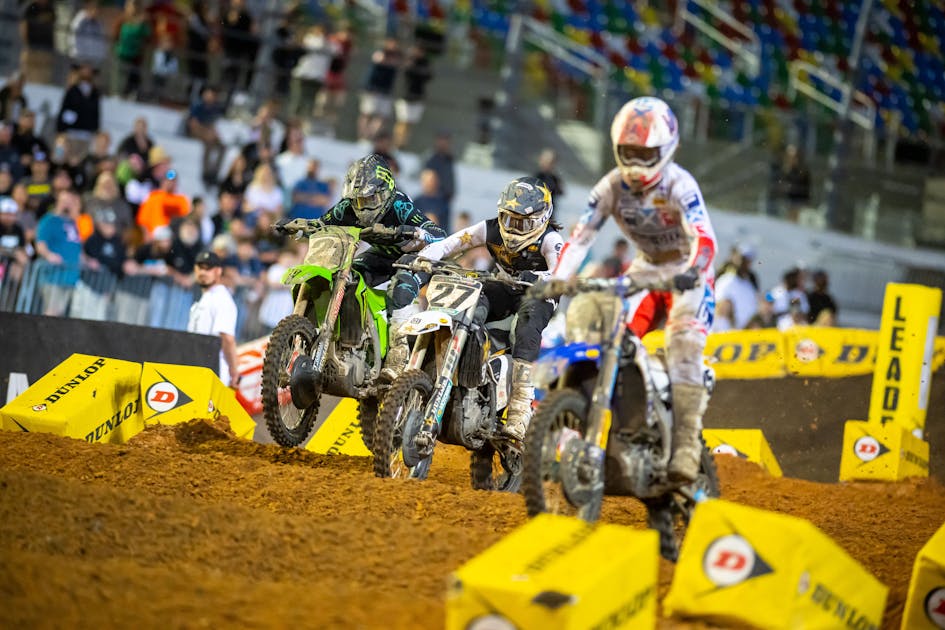 In the 250SX Class, it was Jett Lawrence claiming the main event win, his second of the 2022 season. Behind Lawrence was Stilez Robertson, who holeshot the main event and finished second to earn his second career podium at the venue. Yamaha’s Enzo Lopes ran third for a majority of the race, but Kawasaki’s Cameron McAdoo, GasGas’ Pierce Brown, and Husqvarna’s RJ Hampshire battled for the final spot on the podium, which eventually went to McAdoo. With his win, Lawrence reclaimed the 250SX East Region points lead by five over McAdoo as Robertson’s great ride bumps him third place in the standings.