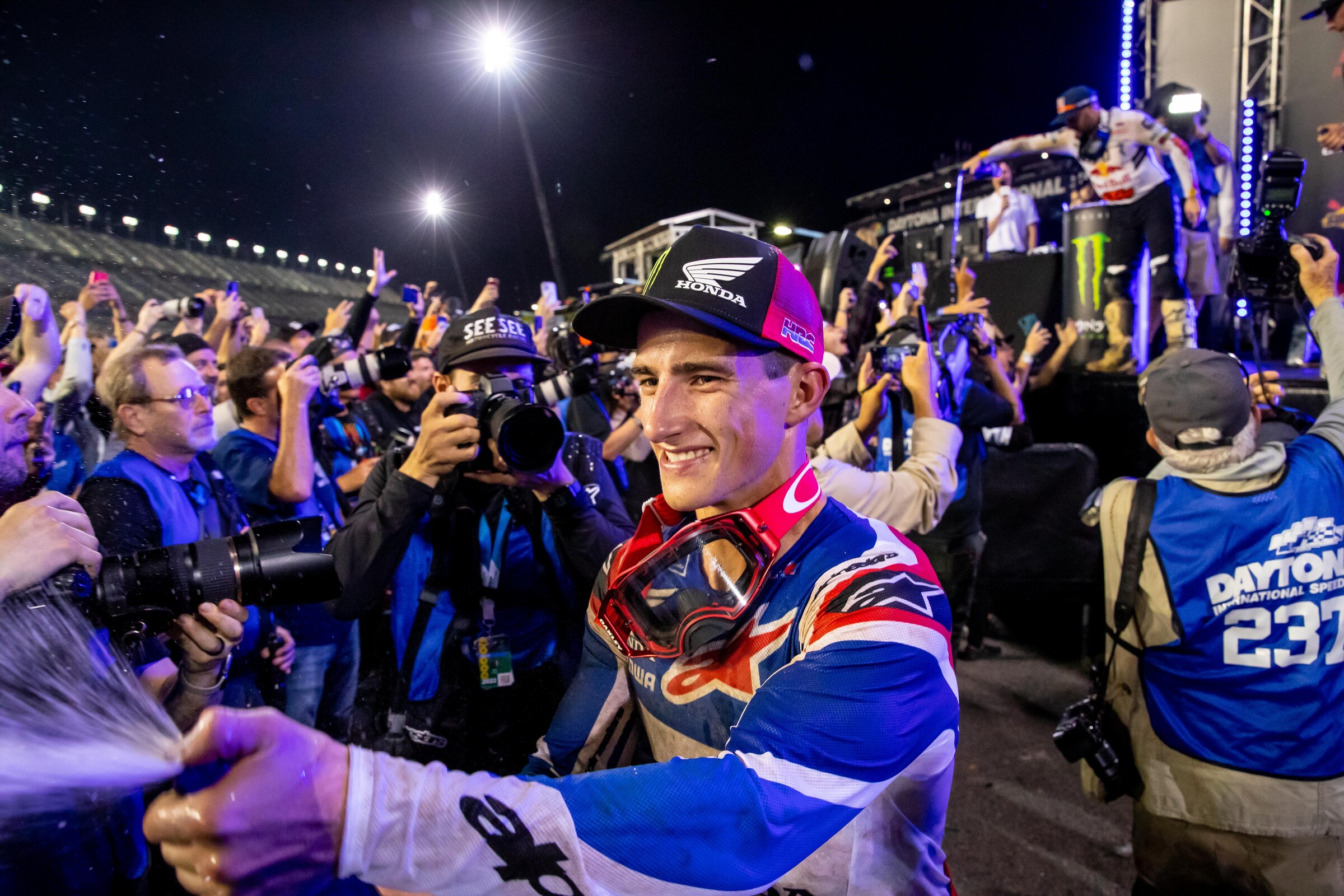 When the dust settled at the 2022 Daytona Supercross, three riders went home happy but were still searching for more. Red Bull KTM’s Cooper Webb led most of the 450SX main event before getting caught behind lapped rider Shane McElrath and allowing Eli Tomac to sneak by and take the win. Honda HRC’s Chase Sexton ended up third in the 450SX main event but lost touch with Webb and Tomac ahead of him late in the race. And Rockstar Energy Husqvarna’s Stilez Robertson would get second in the 250SX main event but admits there’s still more work to do over a full race distance. All three riders spoke with the media in the post-race press conference about the good and the bad at Daytona.