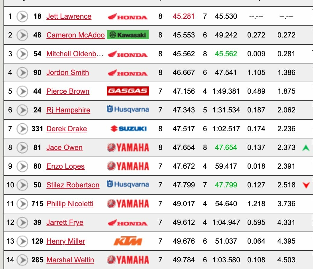 Jett Lawrence took advantage of the line to become the first rider of the day to drop all the way down to the 43’s with a 43.856. His blistering lap put him nearly a full second clear of Pierce Brown in second at the time, but Brown would improve his time down to a 44.170 and close to within three tenths of Lawrence.