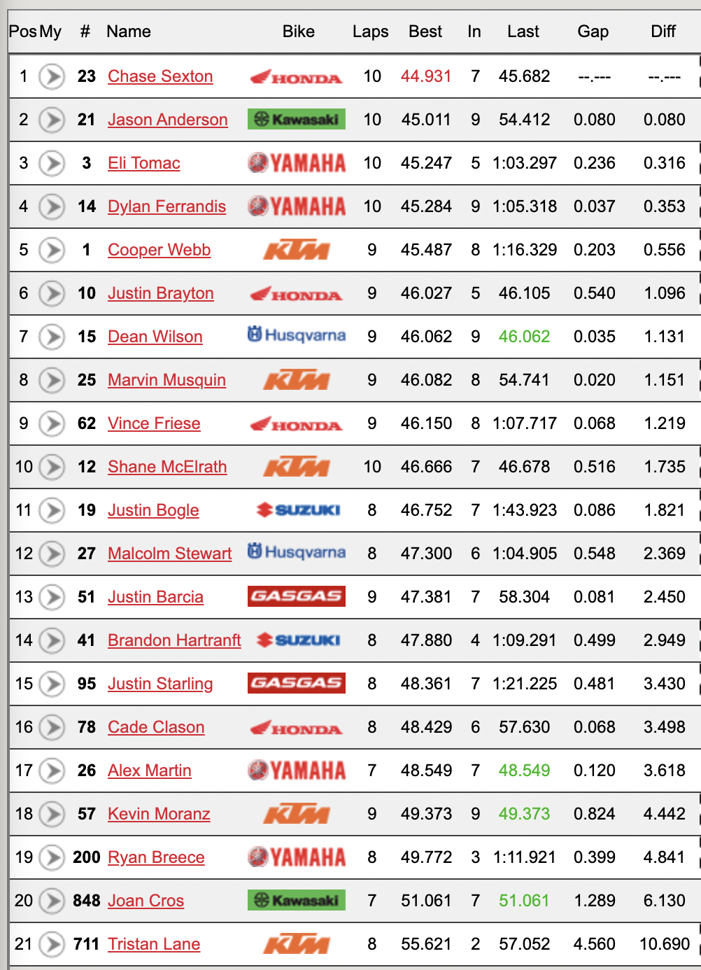 | 2 | Chase Sexton | +06.135 | 0:44.112 | La Moille, IL | Honda CRF450R | |