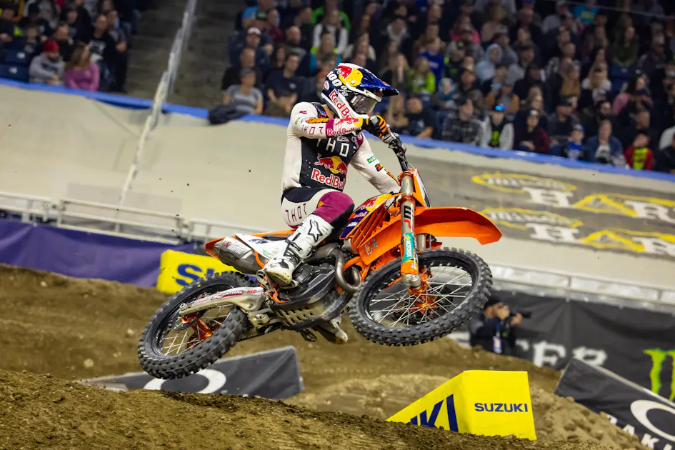Wilson remounted and finished the main event, but at one point four top riders were out with crashes as Sexton, Anderson, Webb, and Ferrandis' nights all ended prematurely. Losing four factory riders is a tough blow for a single race! Anderson’s crash might have been the biggest in terms of the 450SX championship because it allowed race winner Eli Tomac to open his 18-point advantage to now 42 points. Webb was already over a full race down (33 points to be exact) from Tomac in the standings, but his 20th in Detroit means he now sits over two full races down (56 points) following round ten.