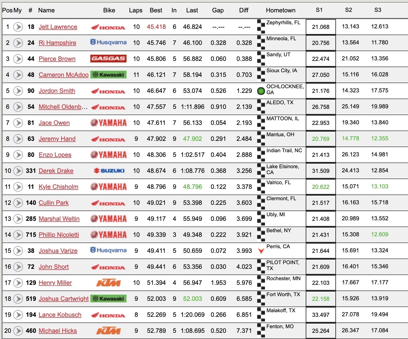 | 5 | Jordon Smith | 45.9220 | Belmont, NC | Honda CRF250R |