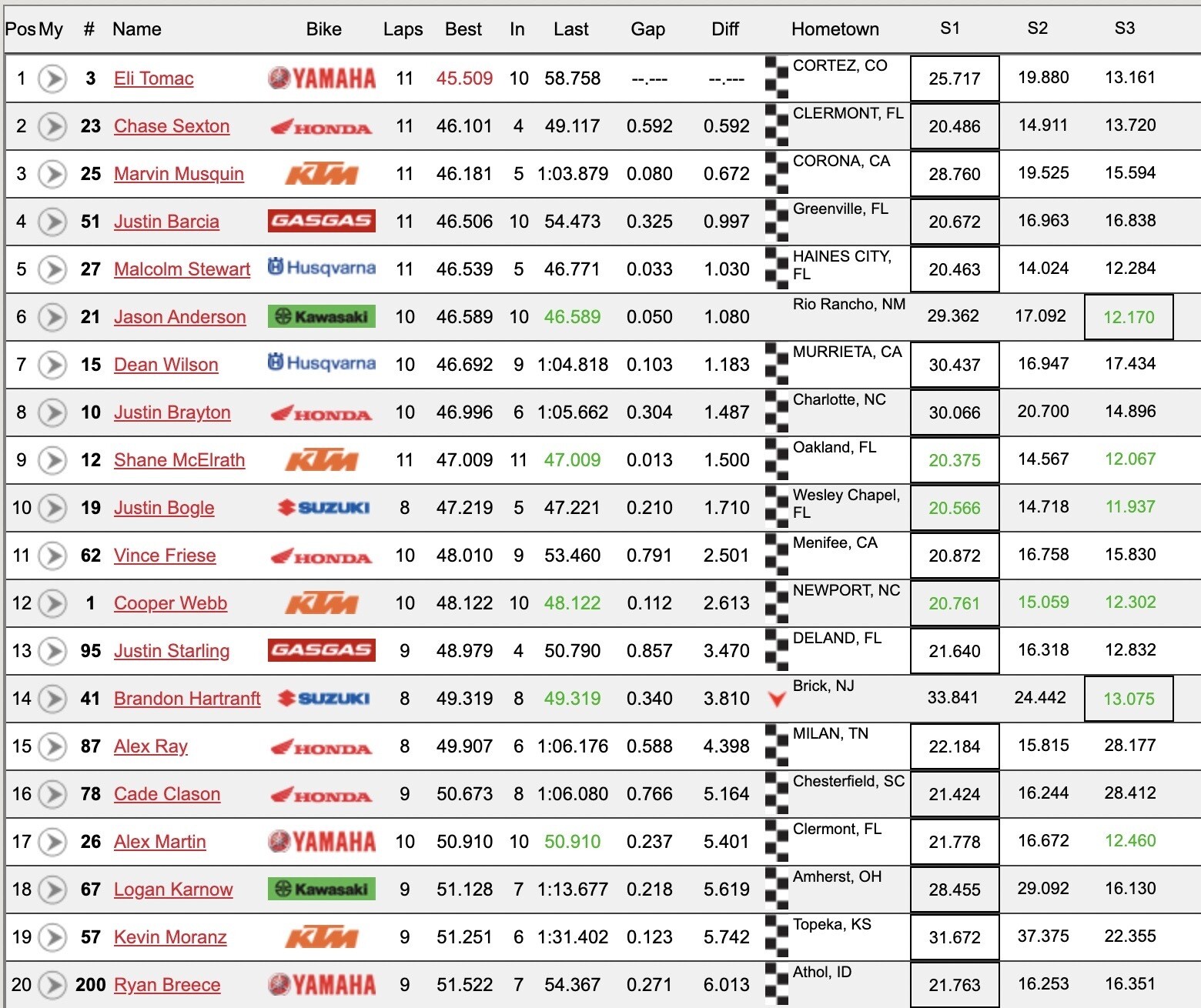 | 2 | Chase Sexton | +09.958 | 0:44.712 | La Moille, IL | Honda CRF450R | |