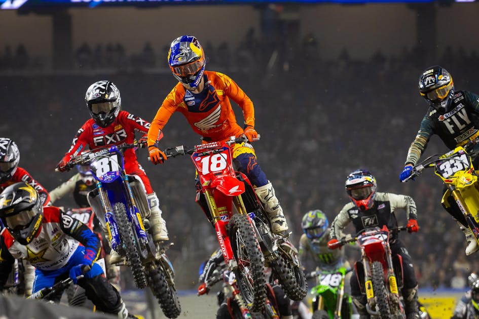 In the 250SX main event, it was championship leaders Jett Lawrence and Cameron McAdoo going back and forth early in the race. Lawrence started with the race lead but in the middle portion of the race it appeared McAdoo had the upper hand. Eventually, Lawrence caught up to the Kawasaki rider and made a pass to get back into the top spot, and he would hold it until taking the checkered flag. McAdoo held on for second place as RJ Hampshire held off Pierce Brown by just 0.398 seconds at the finish line for the final spot on the podium!