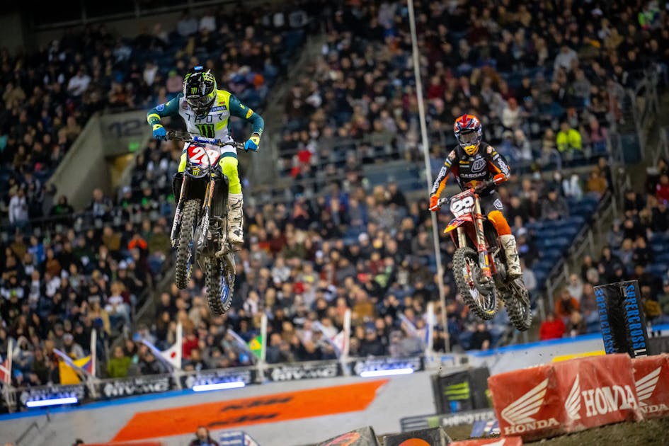 After a five-week break, points leader Christian Craig and the 250SX West Region field returned to action at the Seattle Supercross in Washington. Michael Mosiman took the top pole position in qualifying, joining Hunter Lawrence as the only other rider to top Craig in qualifying in 2022. The two were in separate heats—Craig won the first heat as Mosiman finished fourth in the second heat—and then the two got into it early in the main event when Mosiman bumped Craig to the ground in the turn before the finish line on the third lap. Mosiman went on to lead five laps before Hunter Lawrence eventually passed him, as did Craig after around the halfway mark. Mosiman held off a late charge from Jo Shimoda to claim the final spot on the podium. Following the race, Mosiman said he had an issue with his rear brake from his get together with Craig and it impacted the remainder of his race. The trio spoke to the media in the post-race press conference. Here is what Craig and Mosiman had to say about their respective nights.