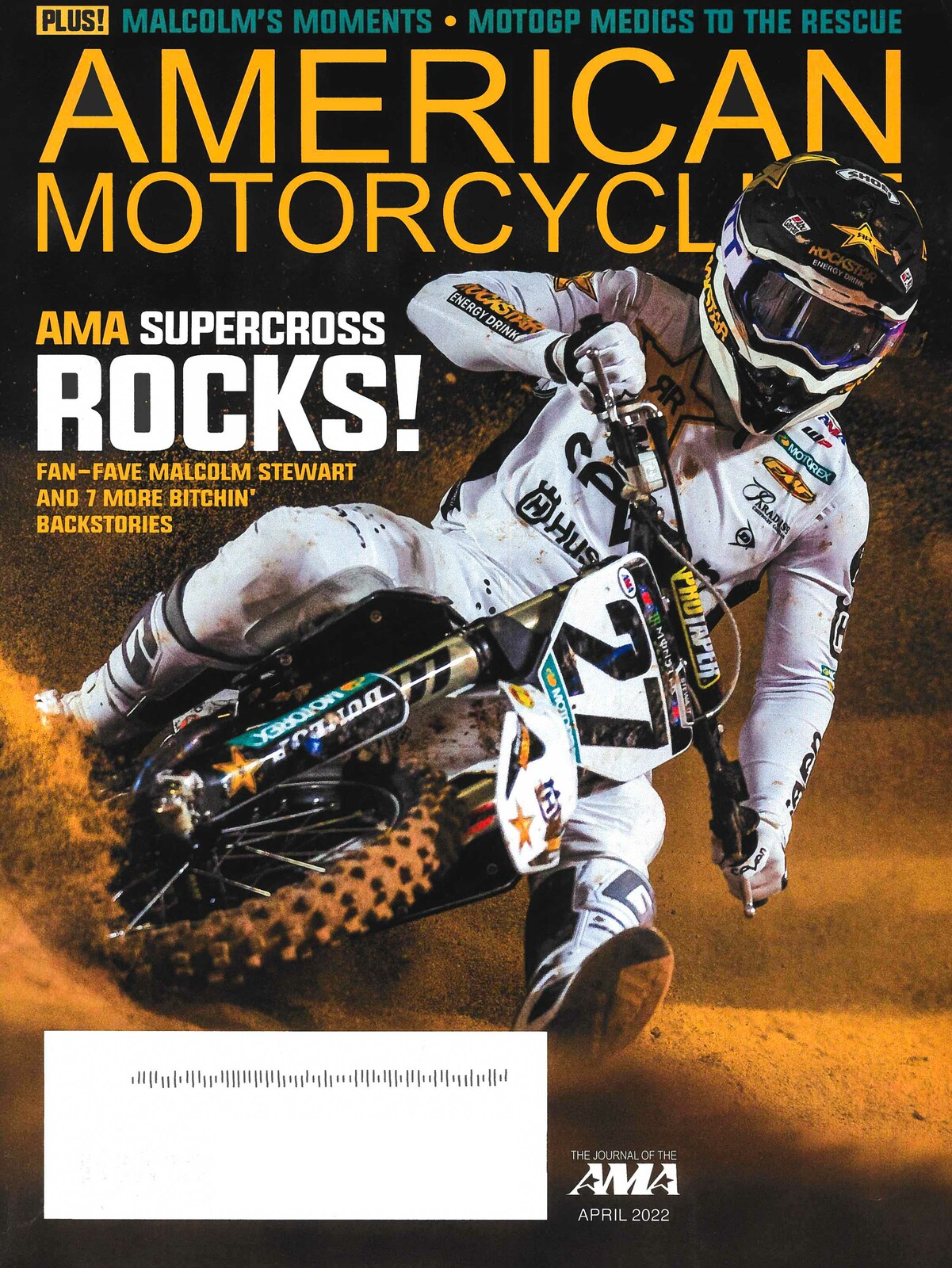 Here’s Malcolm Stewart on the cover of the April issue of American Motorcyclist.