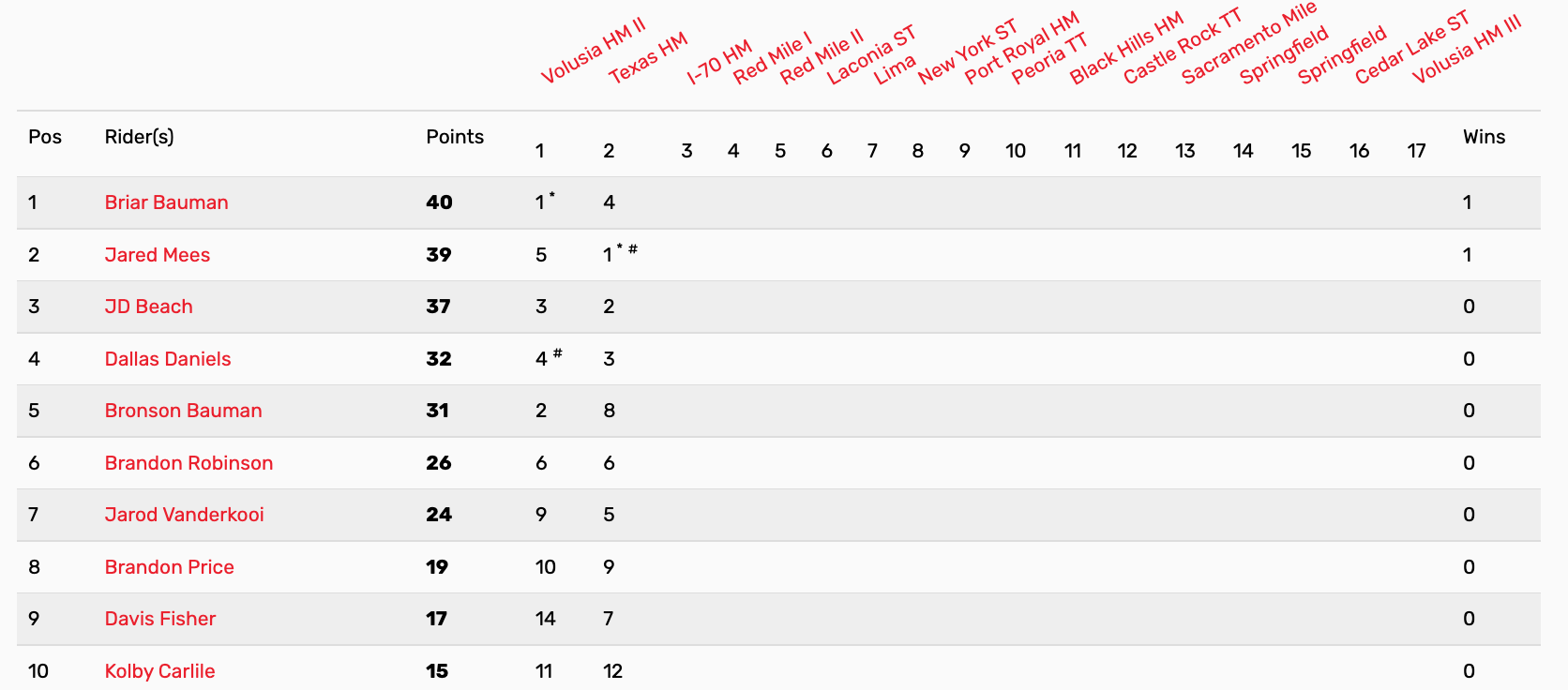 | 10 | Justin Bogle | Cushing, OK | 17 - 9 - 8 | Suzuki RM-Z450 |