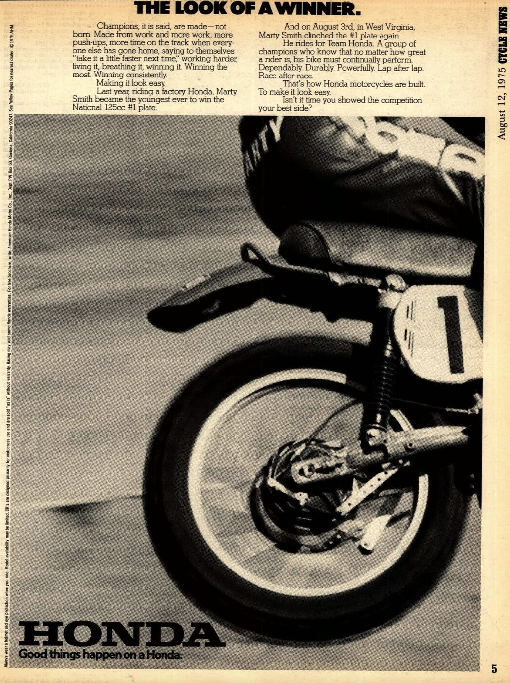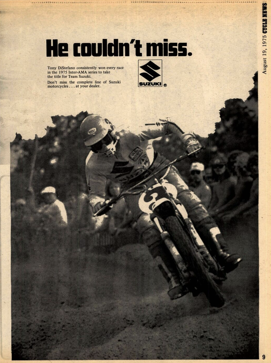 As far as the 250 class goes, Pennsylvania’s Tony DiStefano, now on a factory Suzuki after racing a CZ the previous two years, took his first of what would be three straight 250 National Championships. Tony D. beat a very competitive Kent Howerton by 30 points to add this crown to the one he’d won in the last-ever Inter-Am tour. If 30 points doesn’t sound close, remember that in 1975 first overall paid 150 points and second place was 120 points, so that 30-point difference was basically a single position!