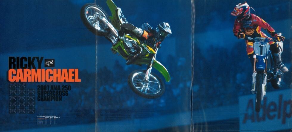 If you’re not a historian, we can catch you up quickly: Jeremy McGrath was and still is the best supercross rider ever, and his 72 wins and seven titles will probably never be touched. His winning ended, though, at the hands of Carmichael during a few epic weeks early in the 2001 season. In 1999 and 2000, Carmichael struggled in his transition to the 250 class and McGrath continued to win. By 2001 Carmichael had figured it out and the battle for supremacy had begun. RC took control and ushered in a new era.
