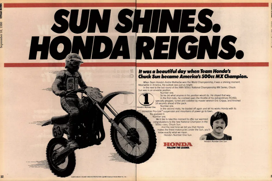 And in the 500 class Chuck “the Rising” Sun of Oregon gave Team Honda its first AMA Pro Motocross title since Marty Smith’s last championship in 1977. Sun topped Kawasaki’s Goat Breker and the now-Suzuki-mounted Smith in the final standings there.