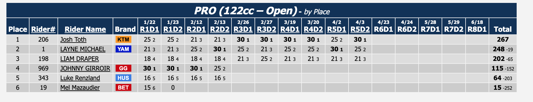 | 8 | Kyle Chisholm | +1:02.109 | 1:24.332 | Clearwater, FL | Yamaha YZ450F | |