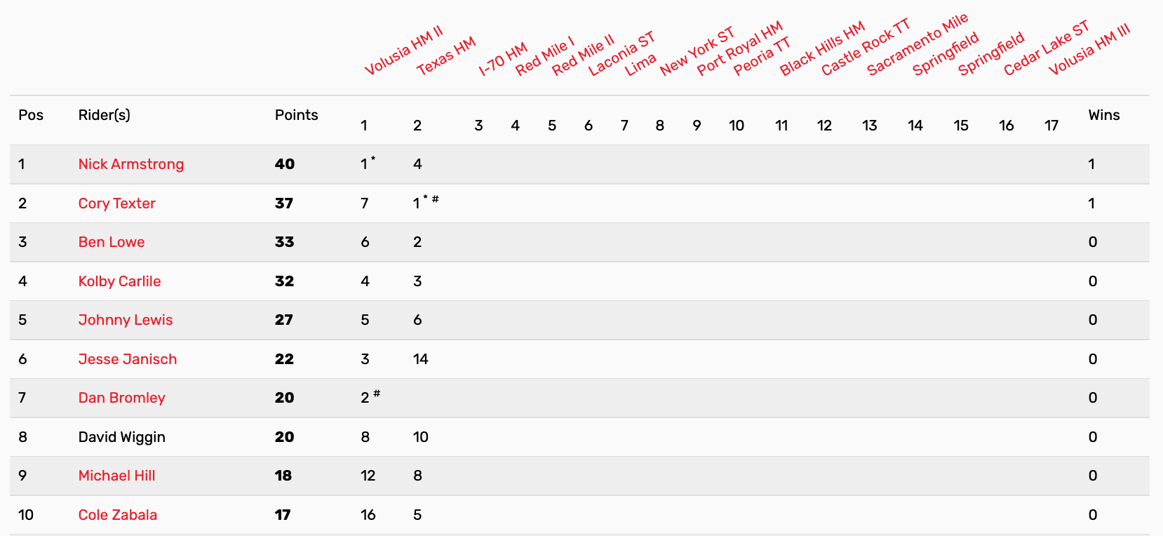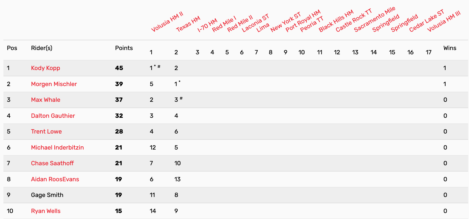 | Kody Kopp (KTM) | American Flat Track | AFT Production Twins |