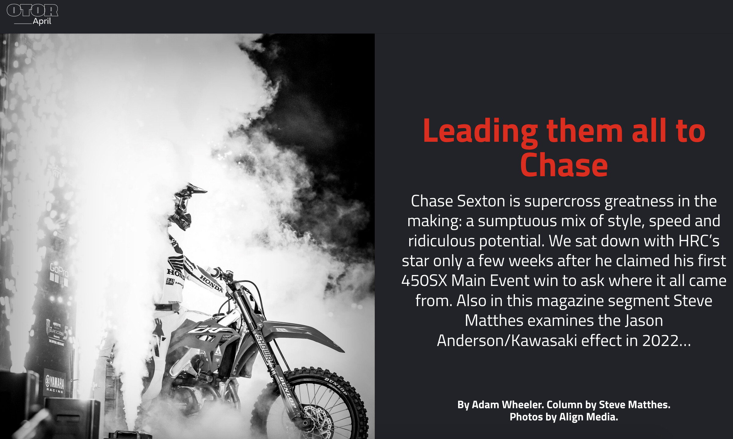 Chase Sexton is supercross greatness in the making: a sumptuous mix of style, speed and ridiculous potential. We sat down with HRC’s star only a few weeks after he claimed his first 450SX Main Event win to ask where it all came from. Also in this magazine segment Steve Matthes examines the Jason Anderson/Kawasaki effect in 2022…