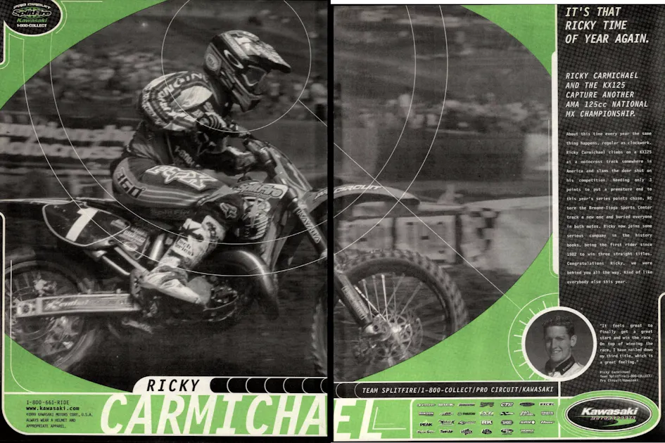 Yes, that’s how 1999 would turn out when you look back in history. Ricky Carmichael was into the final of three dominant summers on a Pro Circuit Kawasaki KX125. He had already tried moving to the 250 class for AMA Supercross in ’99, but he crashed, crashed, and crashed some more. He and the King of Supercross Jeremy McGrath can laugh about it now, but in the summer of ’99, RC went back to the 125 outdoors and went back to his usual domination.