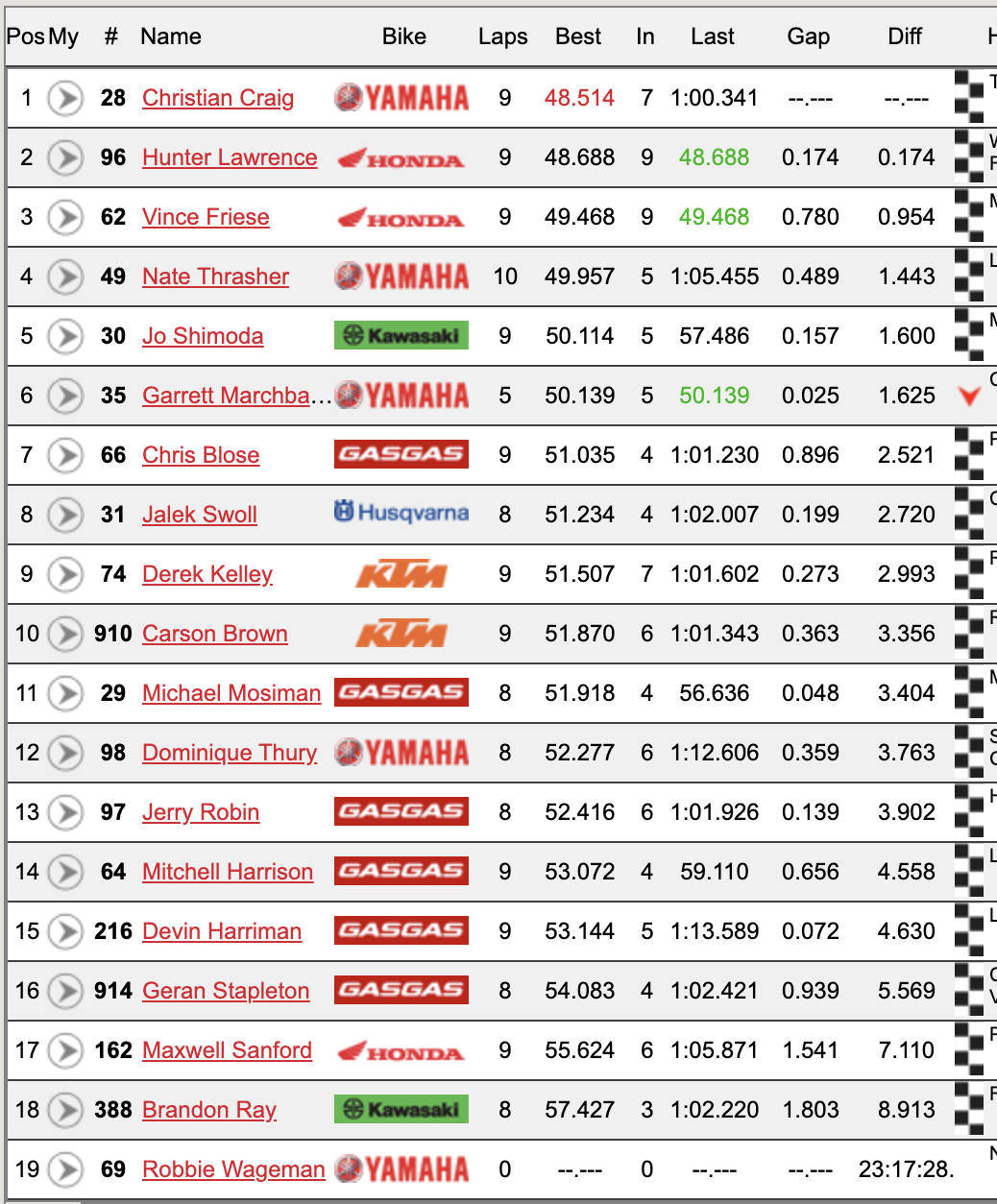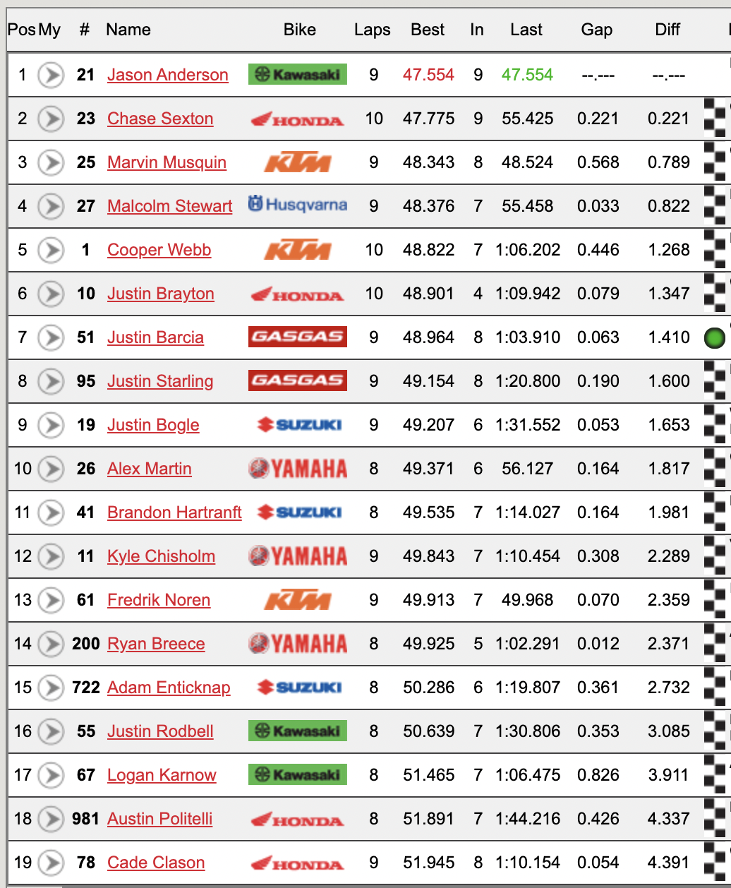 | 3 | Justin Barcia | +10.187 | 0:47.773 | Monroe, NY | GasGas MC 450F | |