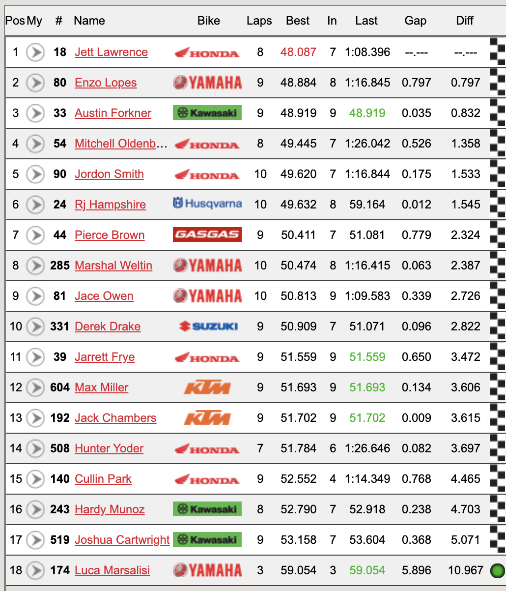 | 5 | Kyle Chisholm | +23.742 | 0:50.658 | Clearwater, FL | Yamaha YZ450F |