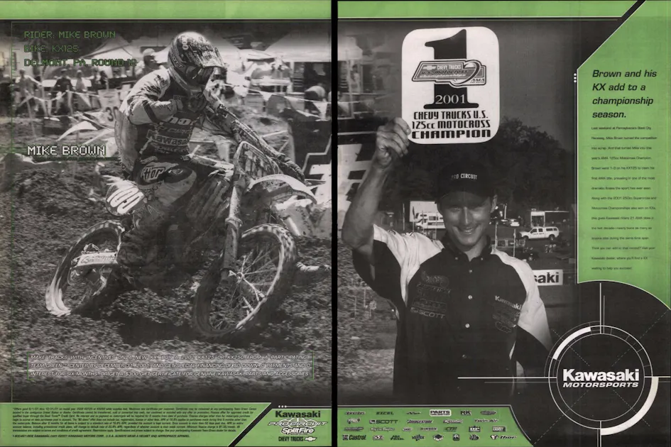 All hell broke loose on the last lap at Unadilla when Pastrana, holding a huge lead over Langston on the last lap of the second moto, crashed on his head as he was doubling up a hill, causing a DNF. Travis made it worse two weeks later when he crashed hard at Washougal, a race won by the suddenly rising veteran Mike Brown, who had finished third in the 125 World Championships the previous year behind Langston and British rider James Dobb. Brown had been picked up by Pro Circuit Kawasaki to race in the U.S. in ’01 and had already won at Budds Creek and Kenworthy’s.