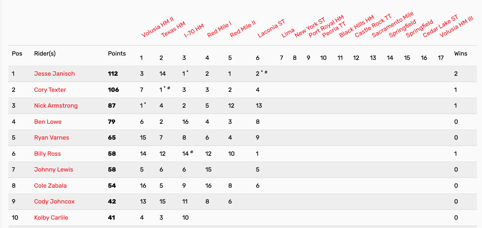 | Jesse A. Janisch (Harley-Davidson) | American Flat Track | AFT Singles |