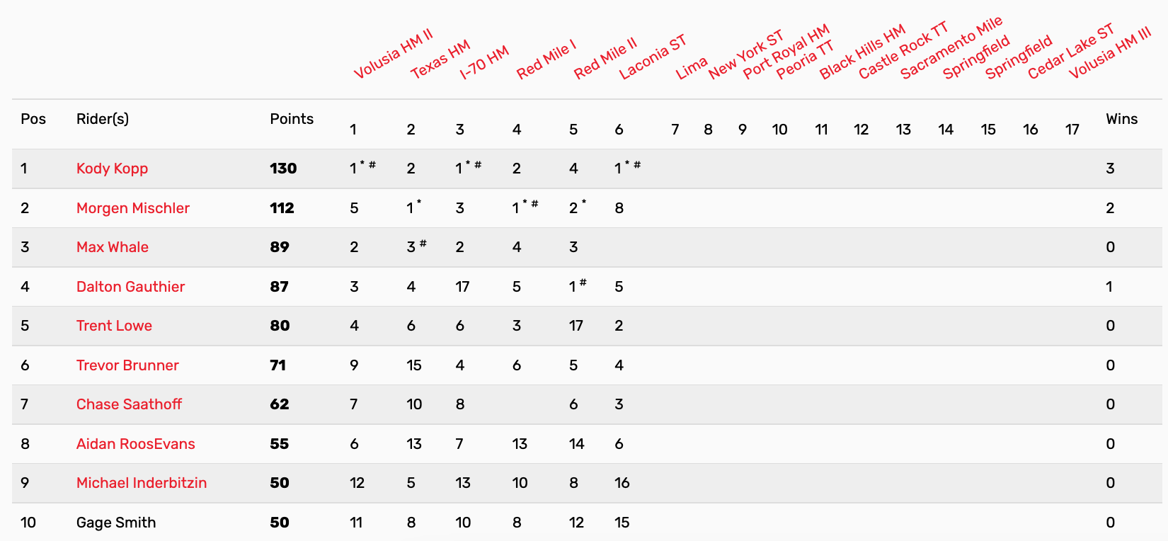 | Kody Kopp (KTM) | American Flat Track | AFT Production Twins |