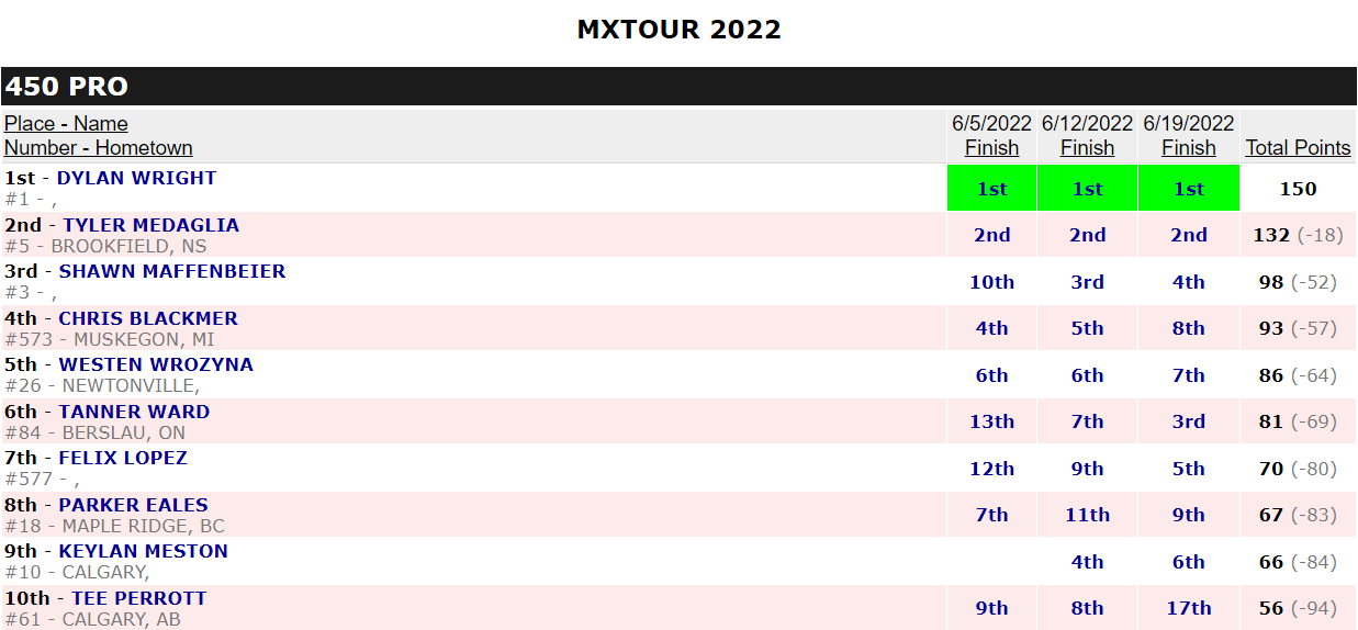 | Dylan Wright (Honda) | Canadian Triple Crown (Combined) | 450 |