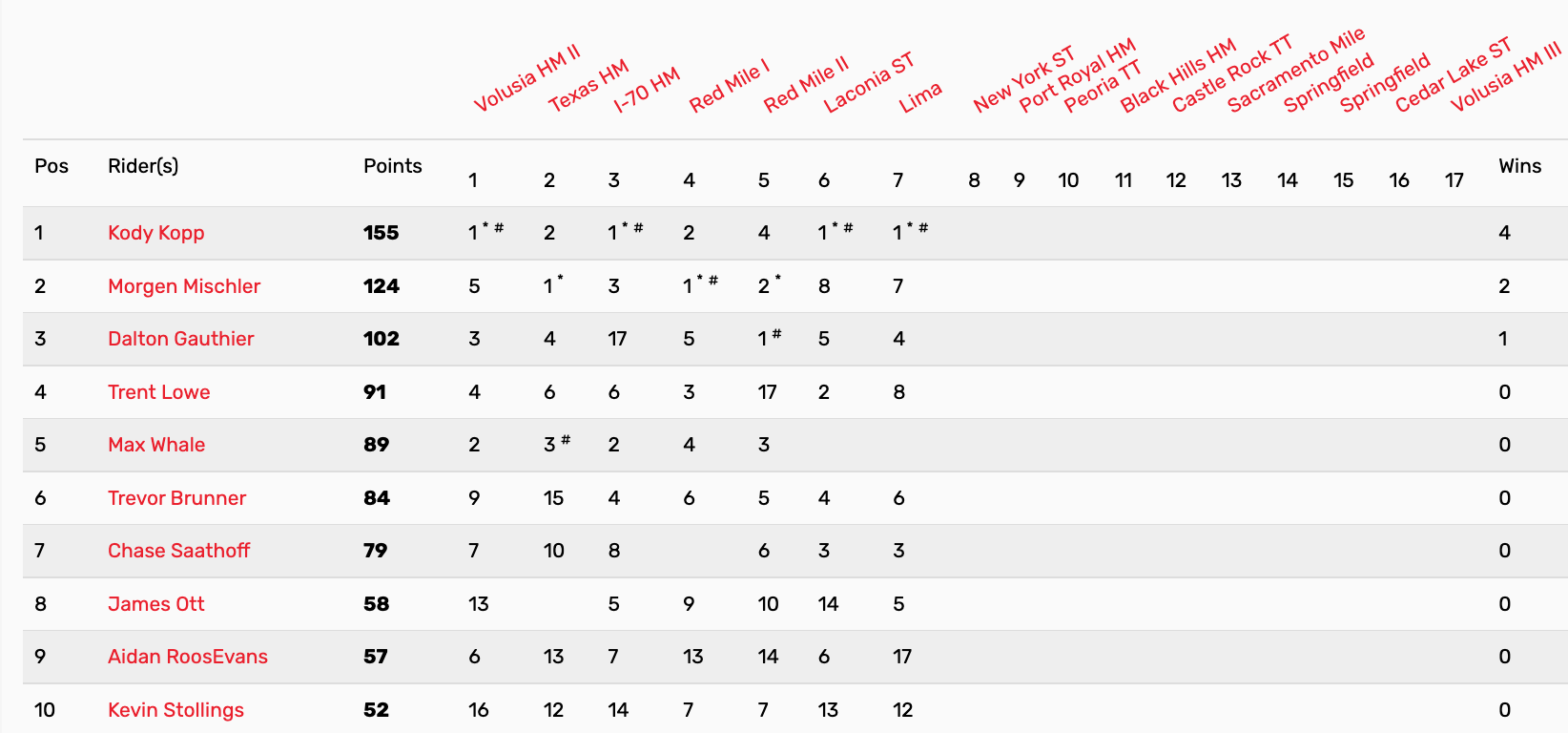 | Kody Kopp (KTM) | American Flat Track | AFT Production Twins |