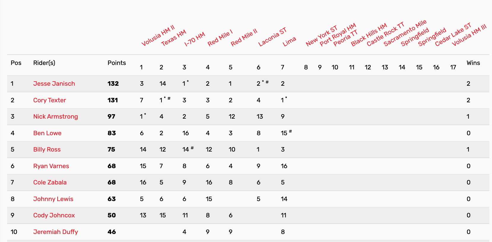 | Jesse A. Janisch (Harley-Davidson) | American Flat Track | AFT Singles |