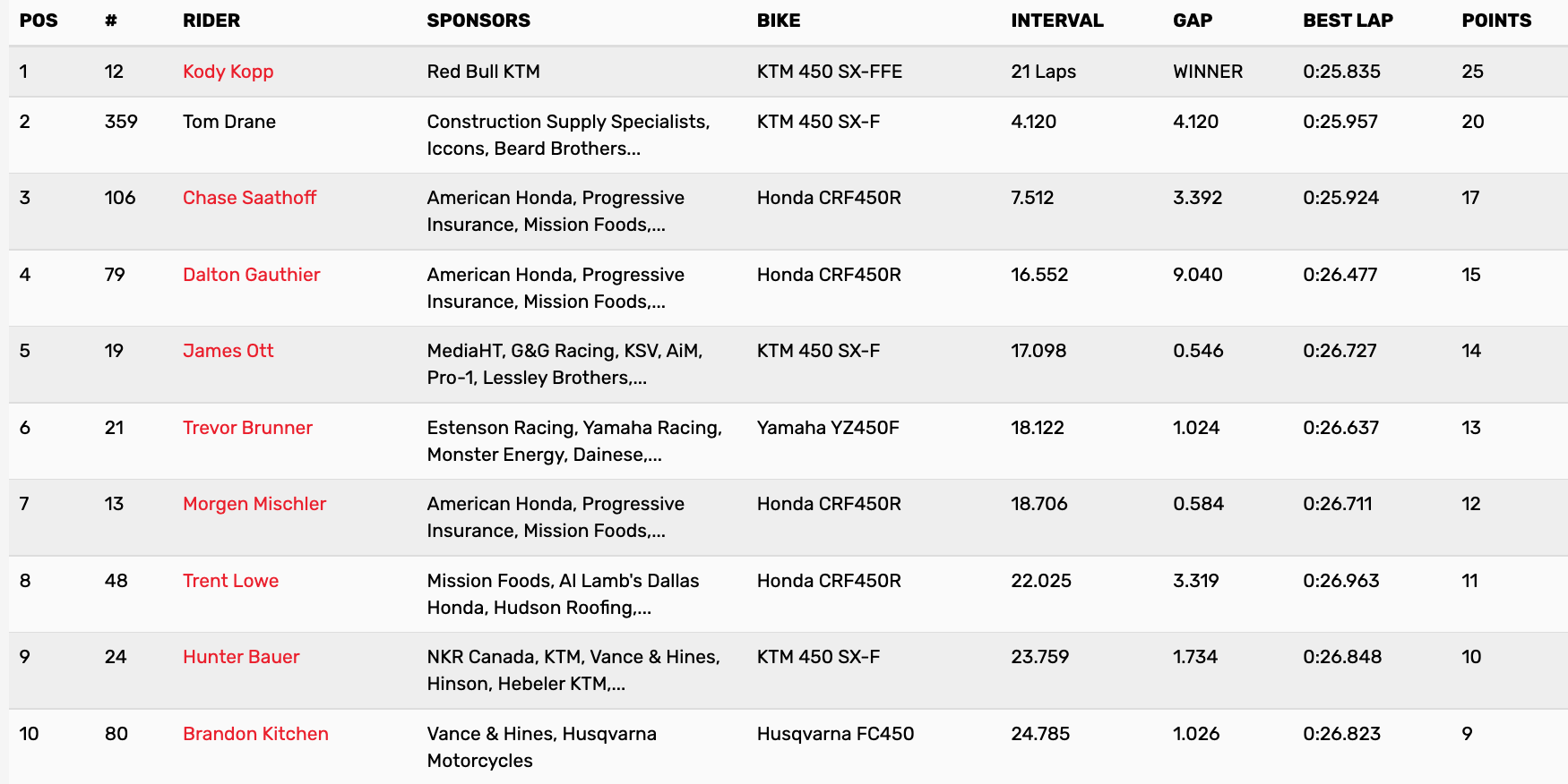| 2 | Zack Hayes | 03:34:48.291 | Sumter, SC | KTM | ||
