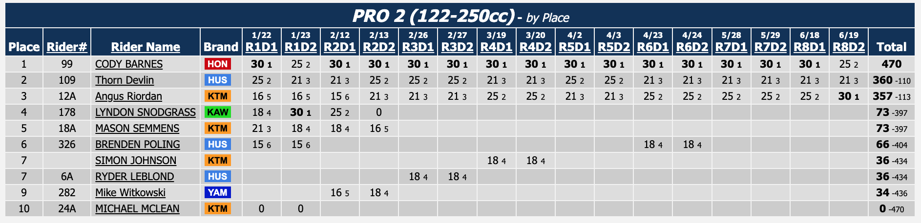 | Cody Barnes (Honda) | U.S. Sprint Enduro | Pro 2 |