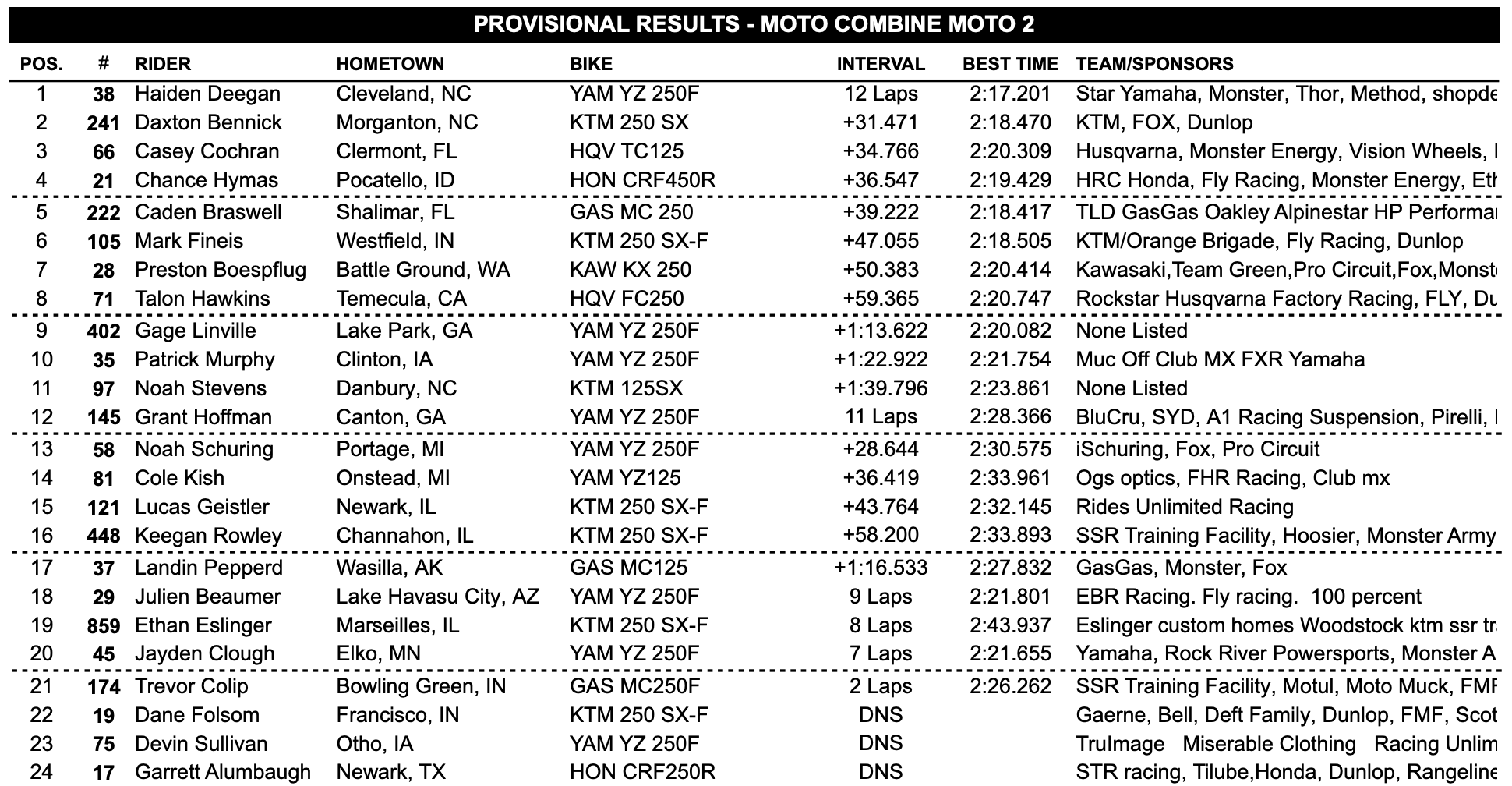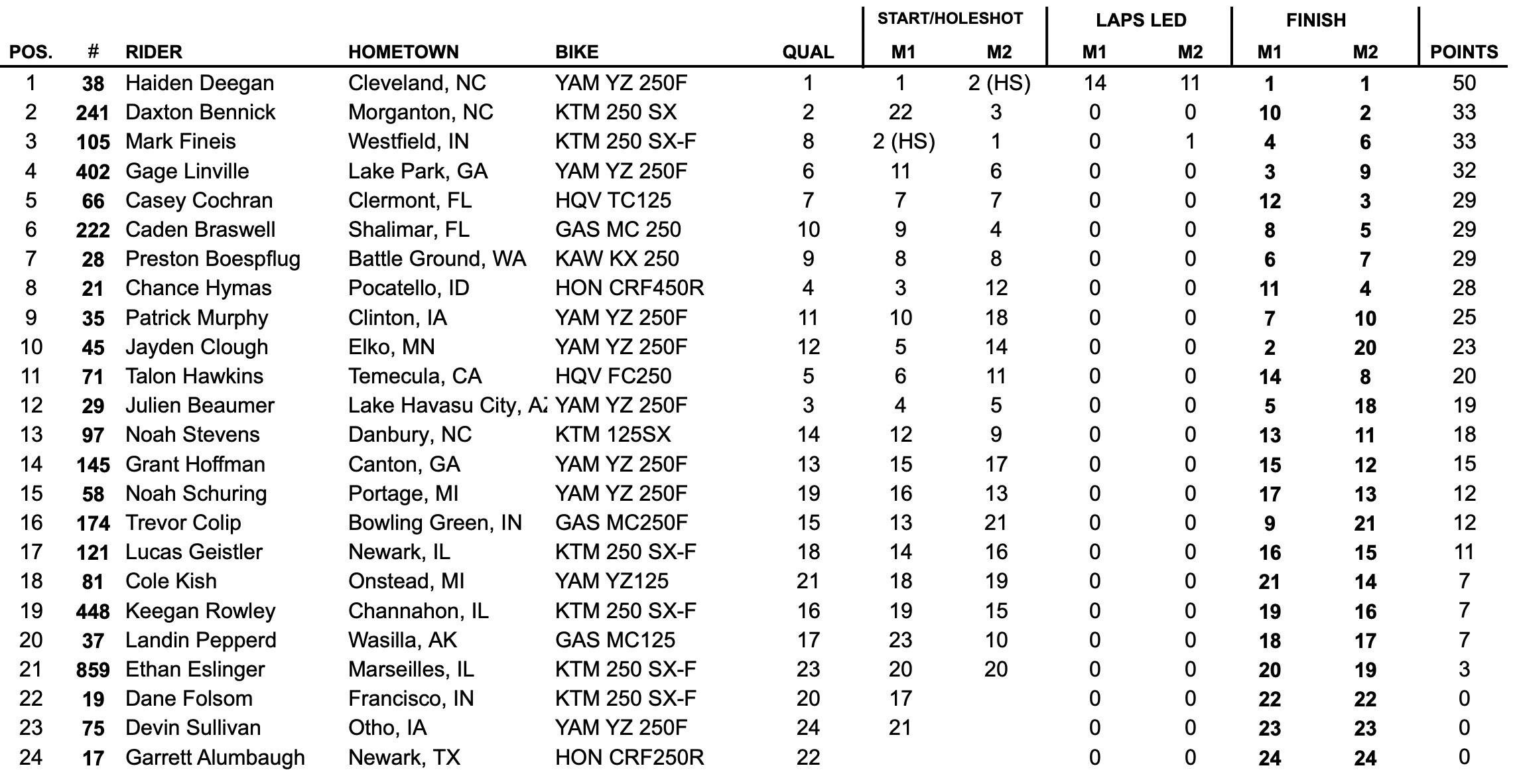 Deegan’s 1-1 easily gave him the overall as Bennick’s 10-2 gave him second overall ahead of Fineis’ 4-6 for third overall. Check out the overall finishes below.